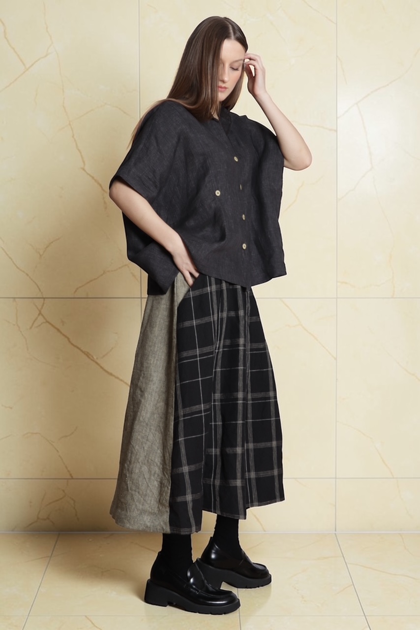 • Conjunto feminino preto com blusa de linho e saia xadrez