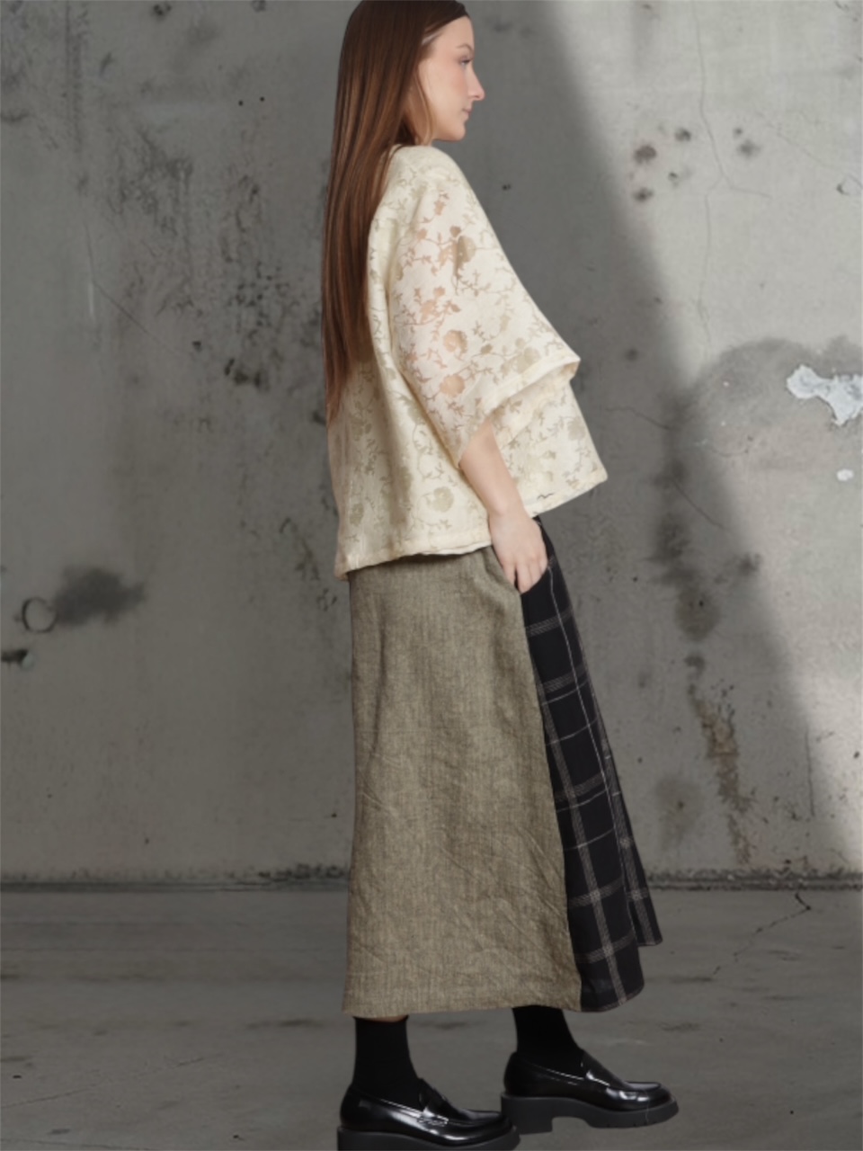 • Mulher de perfil usando blusa creme floral e saia midi bicolor com sapatos pretos