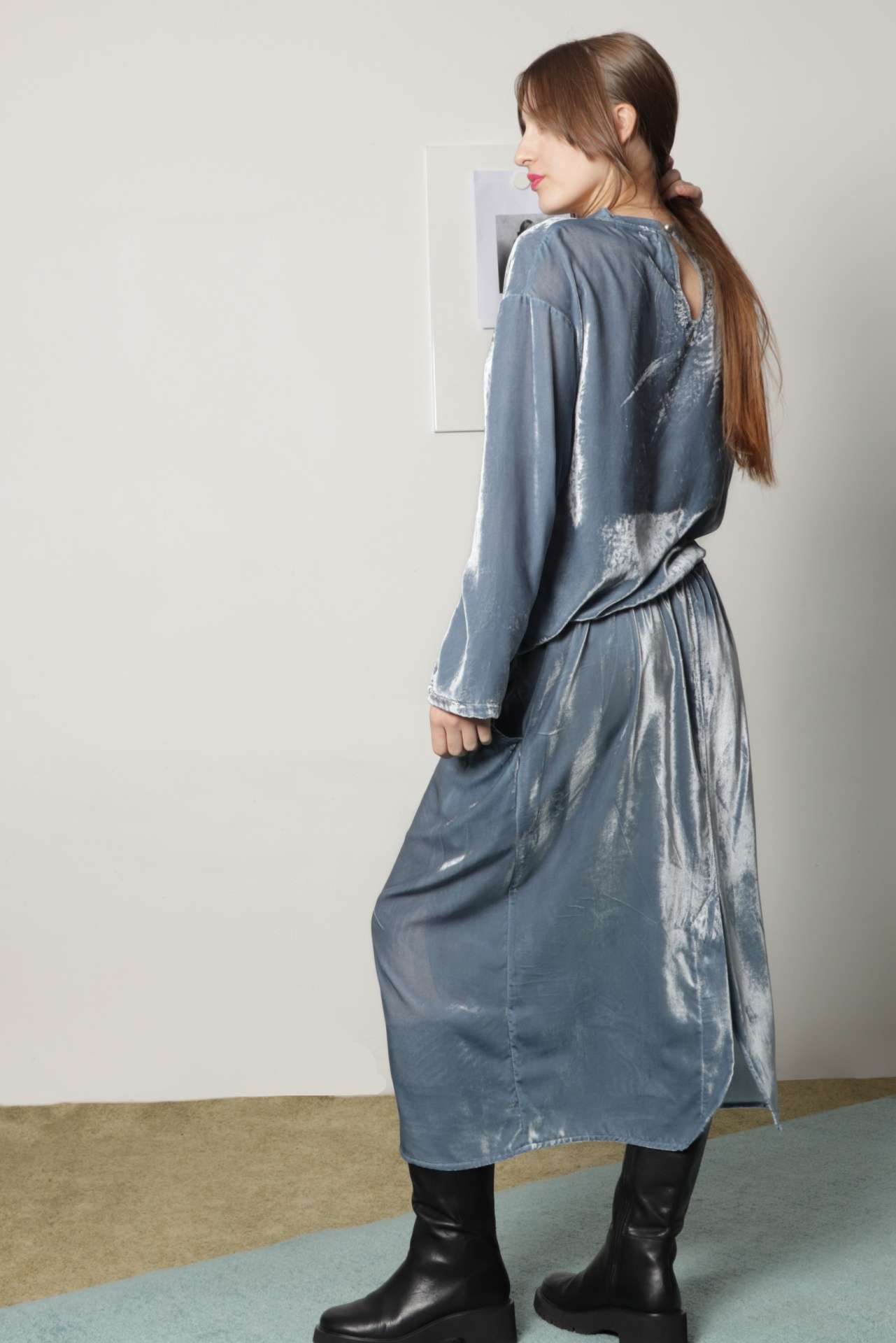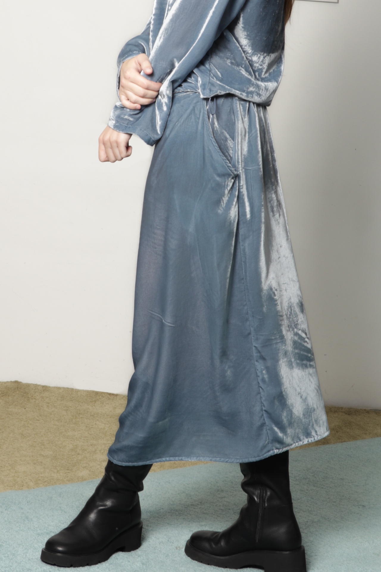 Saia straight-cut comprida em veludo cristal na cor azul claro. Tem elástico nas costas do cinto, bolsos tipo jeans e uma racha atrás, para conforto de movimento. Veste vários tamanhos.