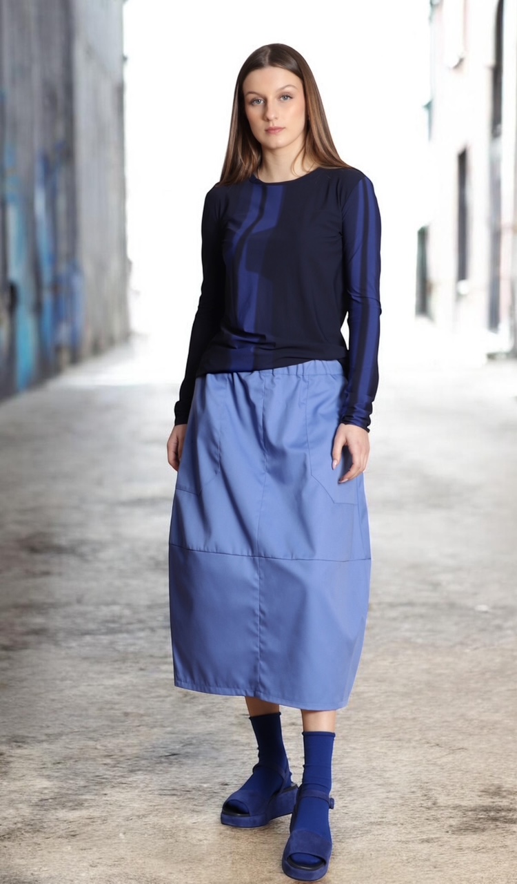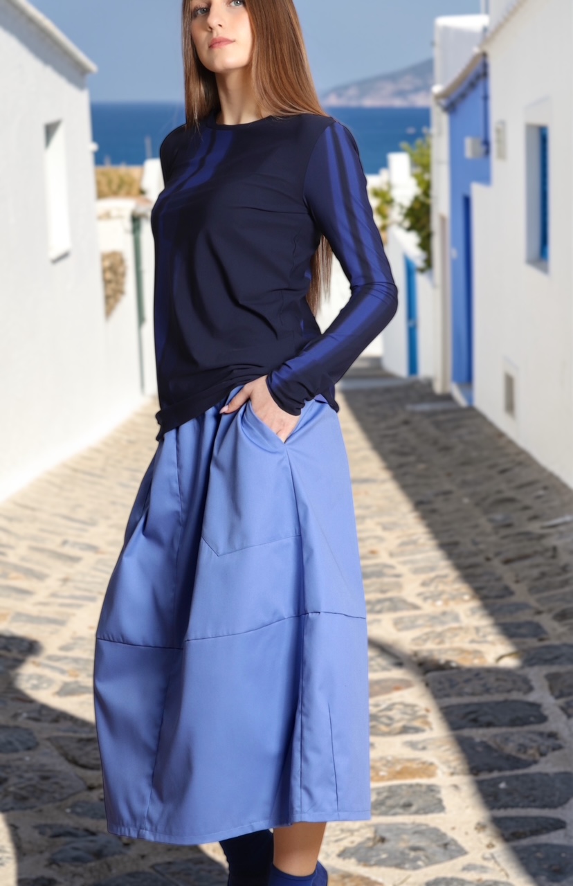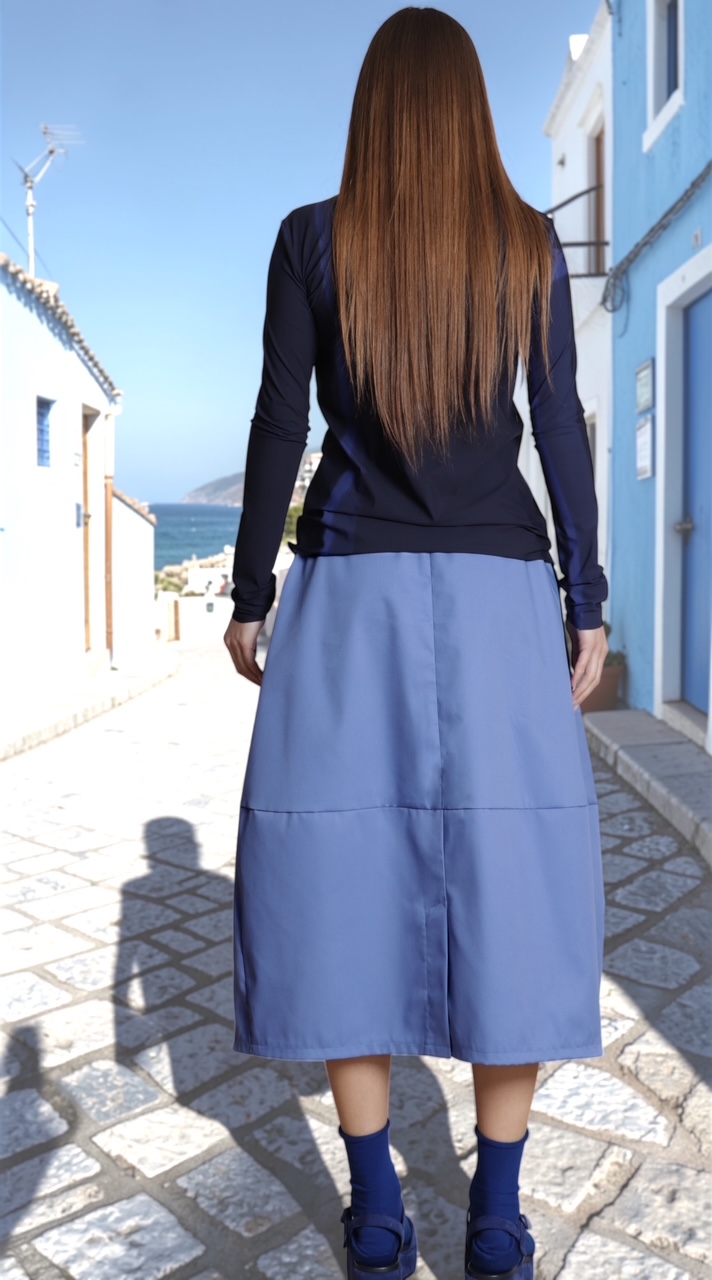 Saia cocoon em sarja de algodão azul céu. Tem elástico circular no cinto, bolsos de chapa pespontados com abertura nas laterais e  pequena racha atrás. Veste vários tamanhos.