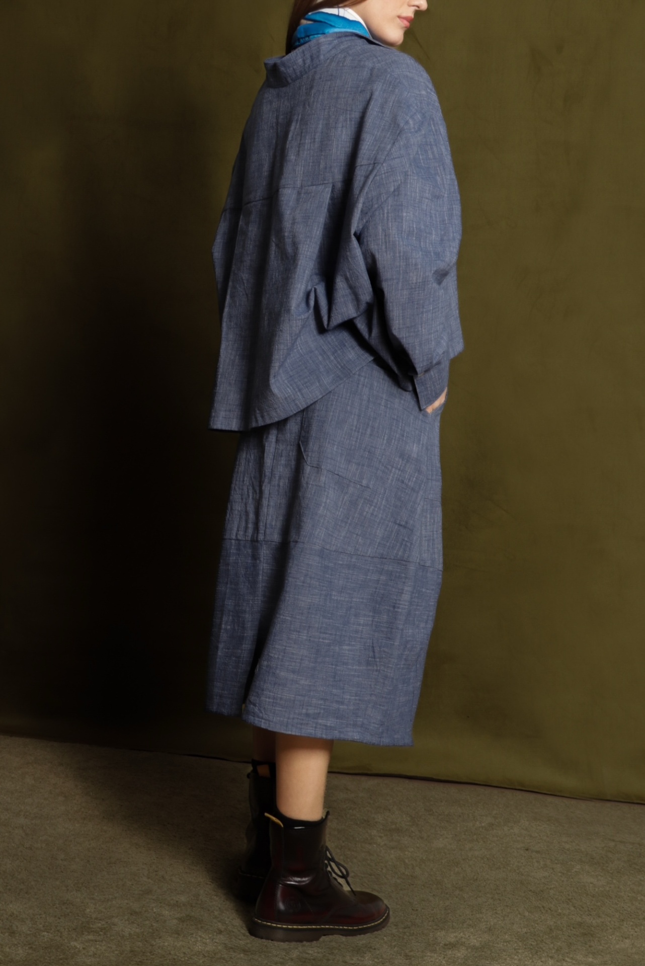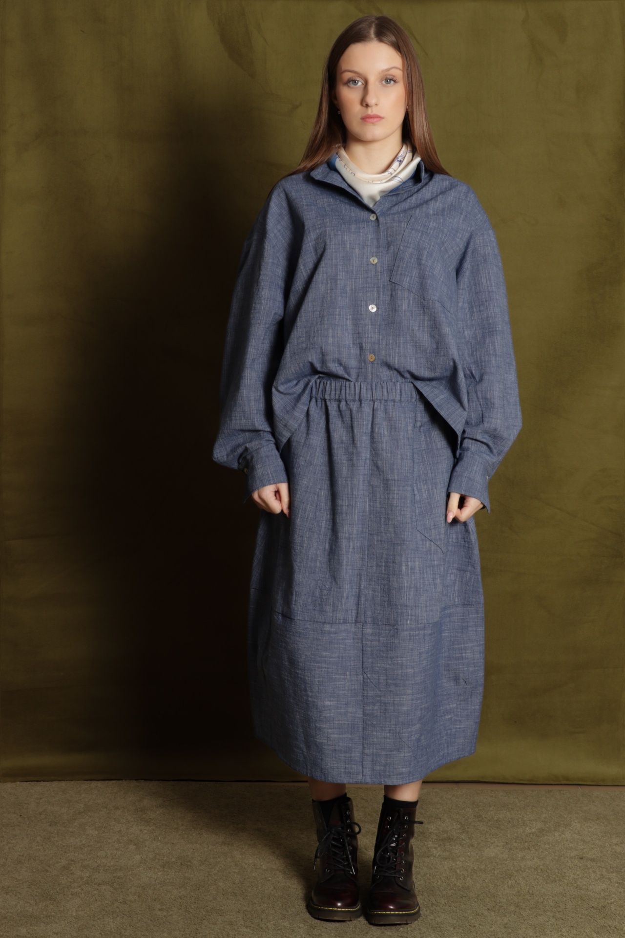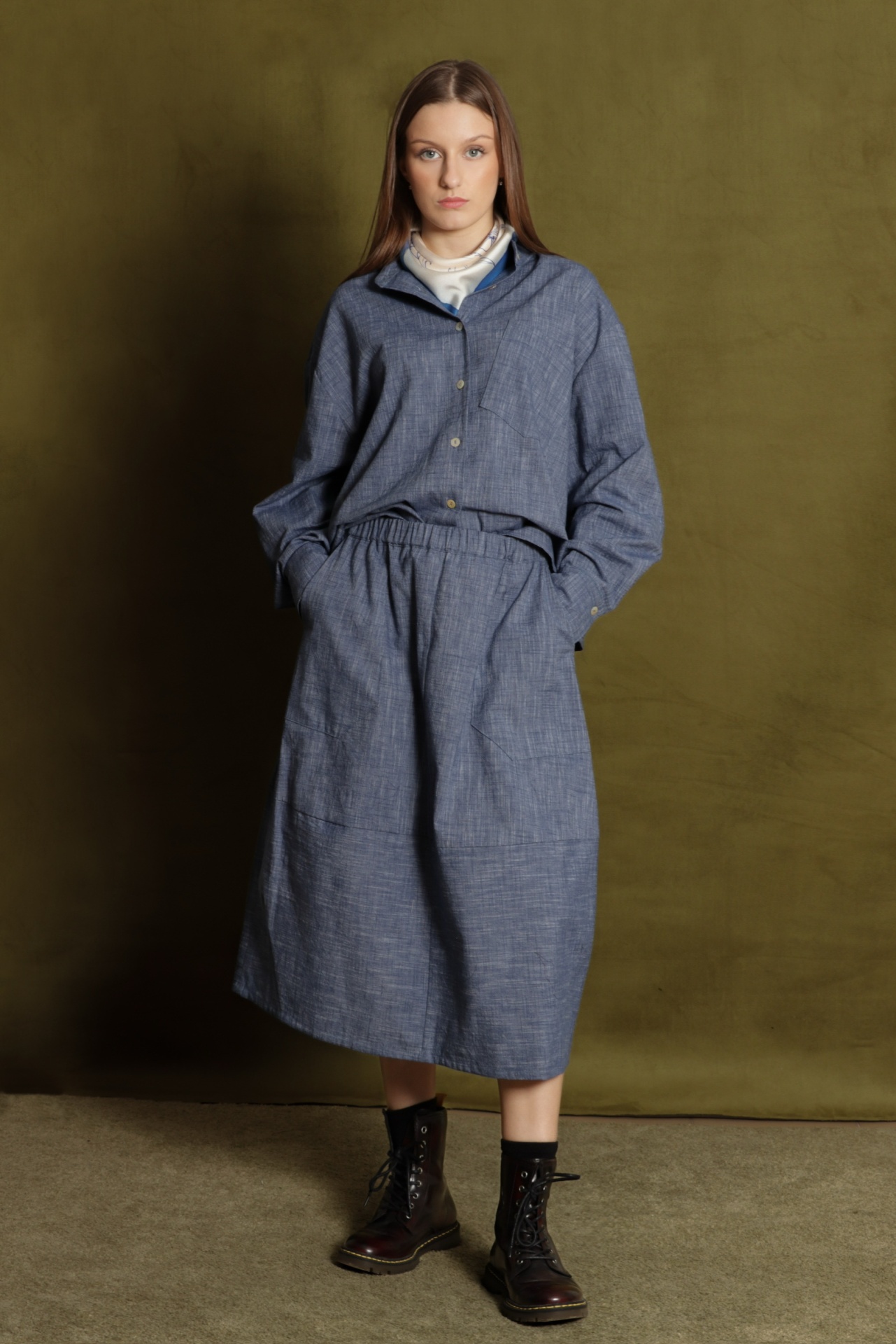 Saia cocoon em tecido de algodão azul mescla. Tem elástico circular no cinto, bolsos de chapa pespontados com abertura nas laterais e um bolso e pequena racha atrás. Veste vários tamanhos.