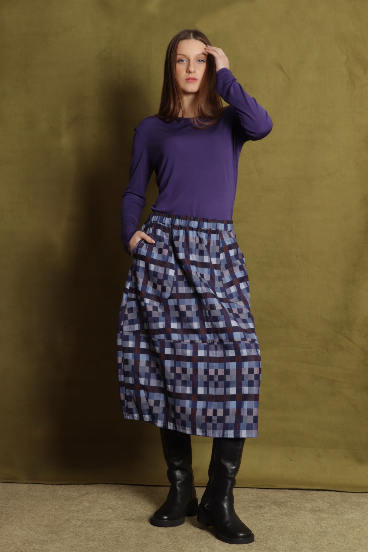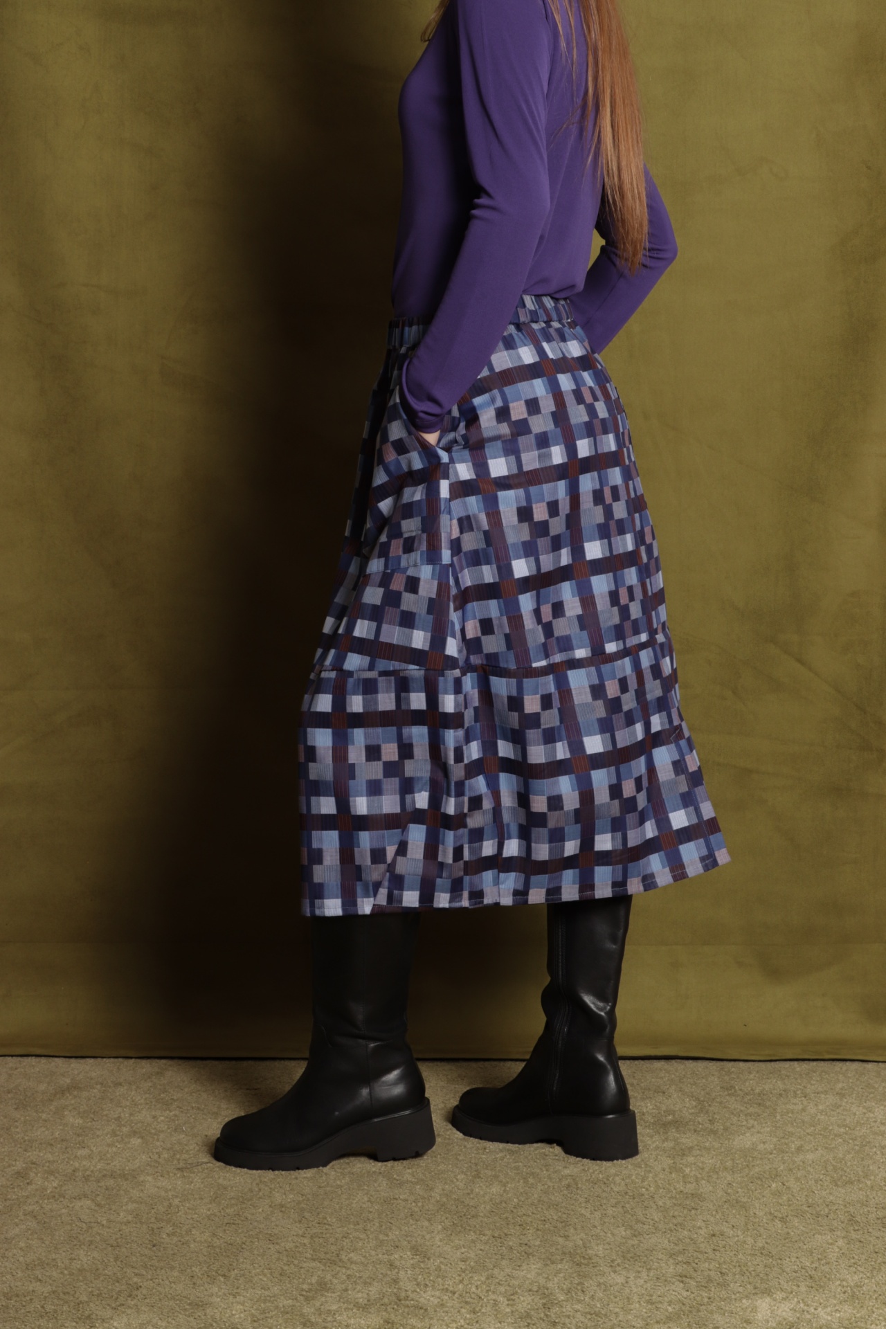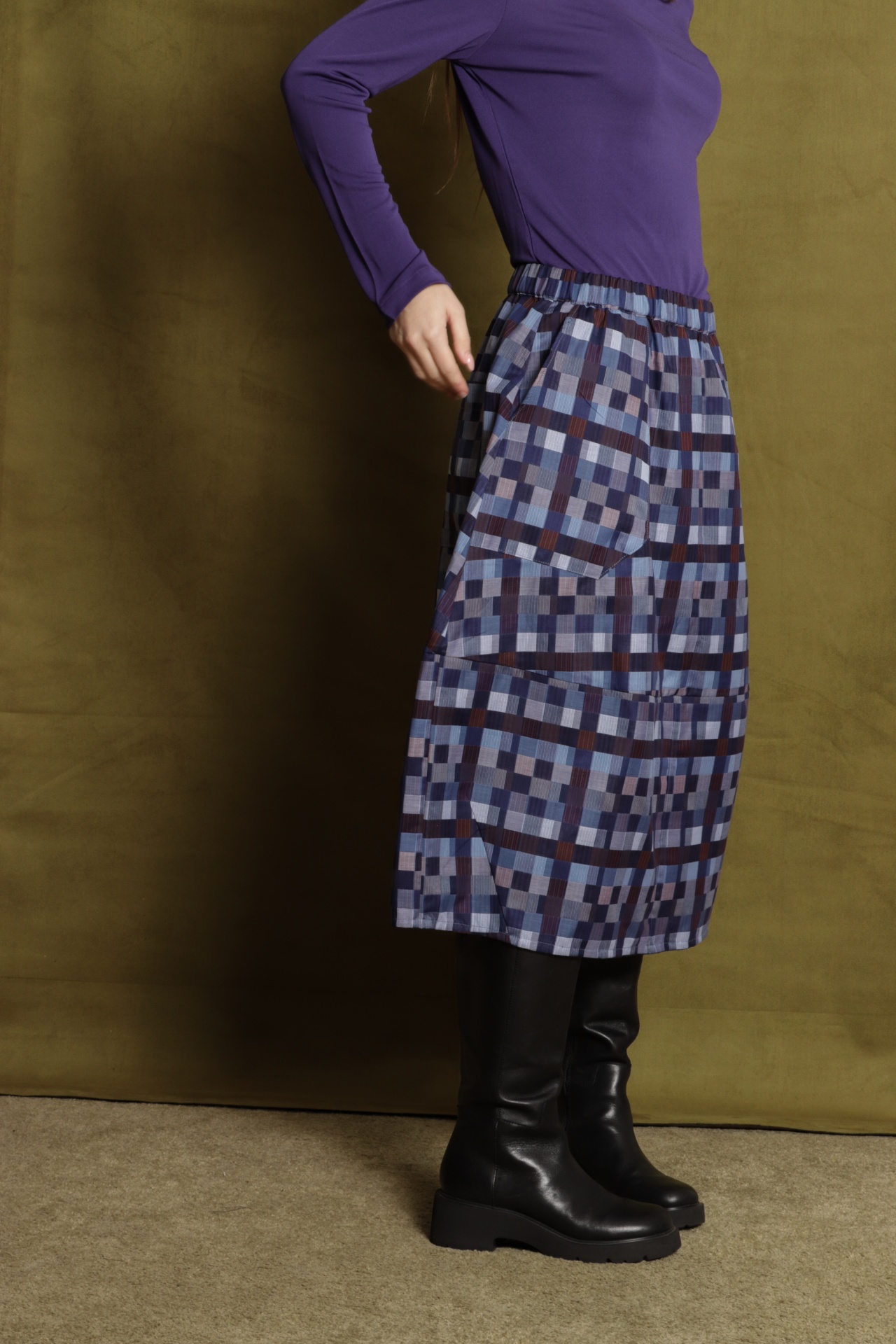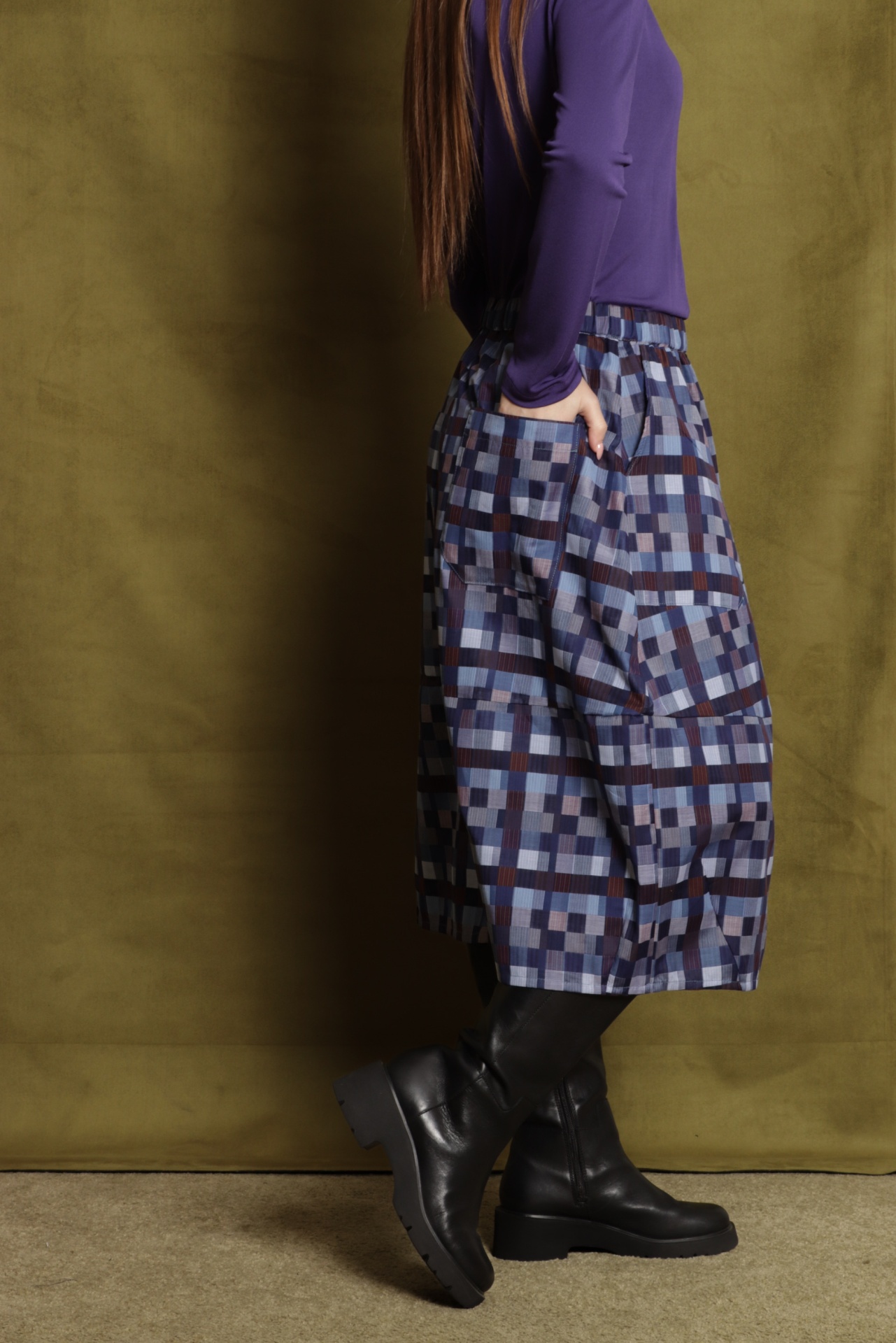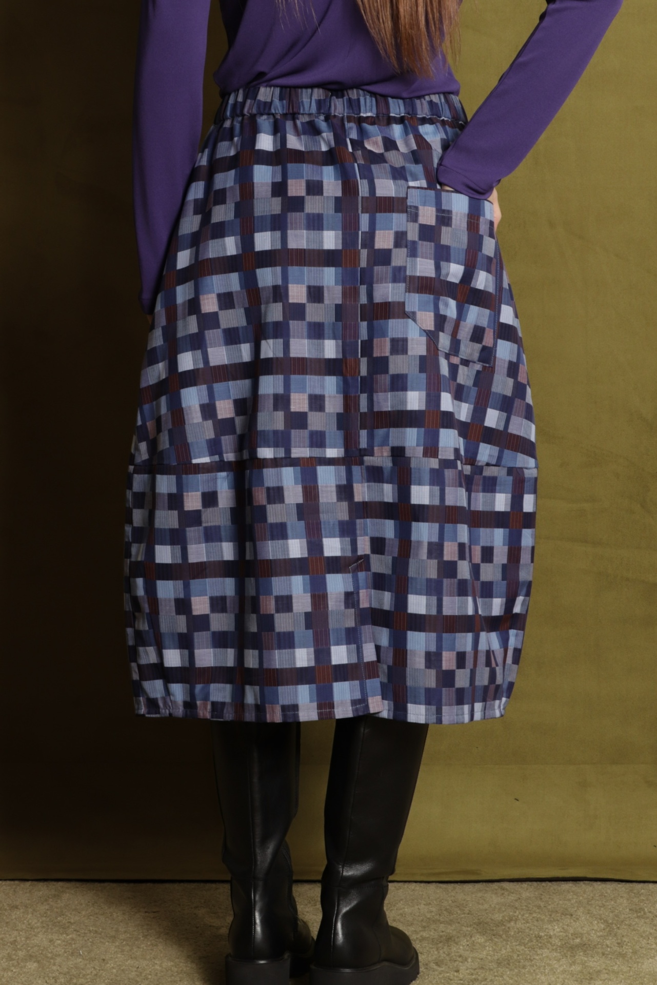 Saia cocoon em xadrez com aspecto patchwork. Tem elástico circular no cinto, bolsos de chapa pespontados com abertura nas laterais e um bolso e pequena racha atrás. Veste vários tamanhos.