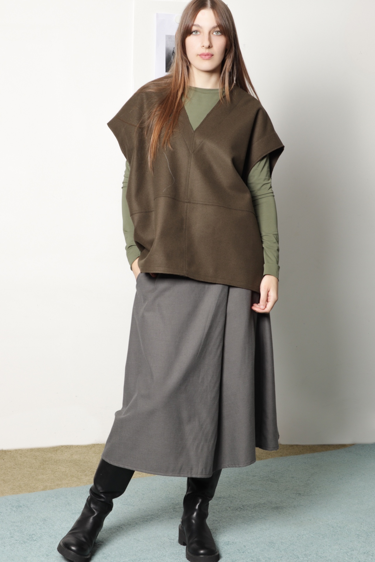 • Mulher a usar camisa verde, colete castanho, saia cinzenta e botas pretas em ambiente interior