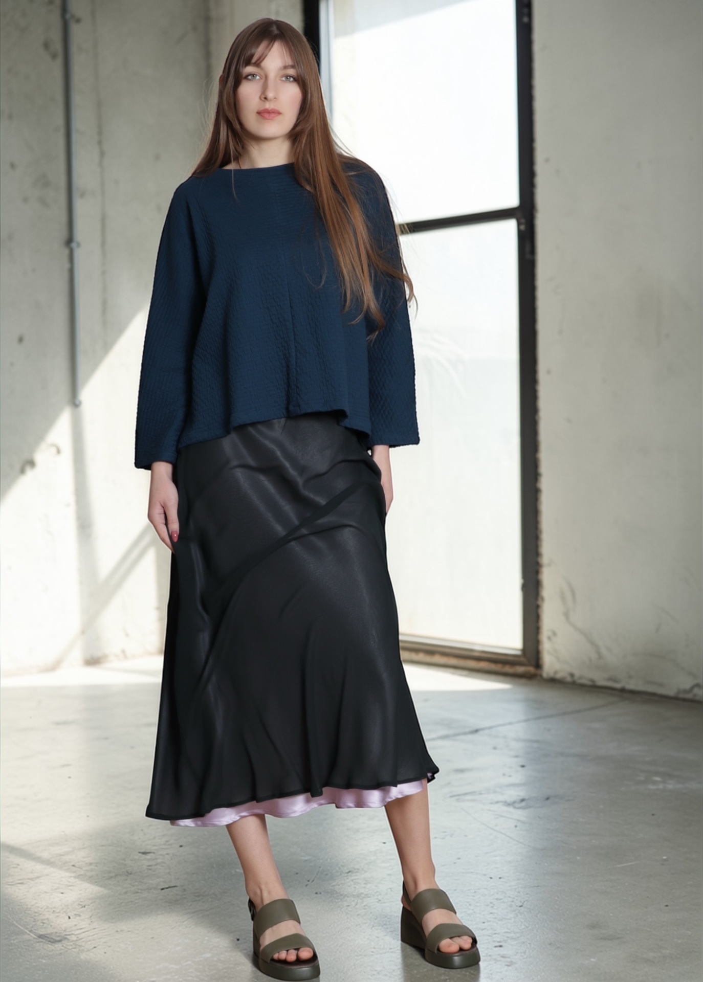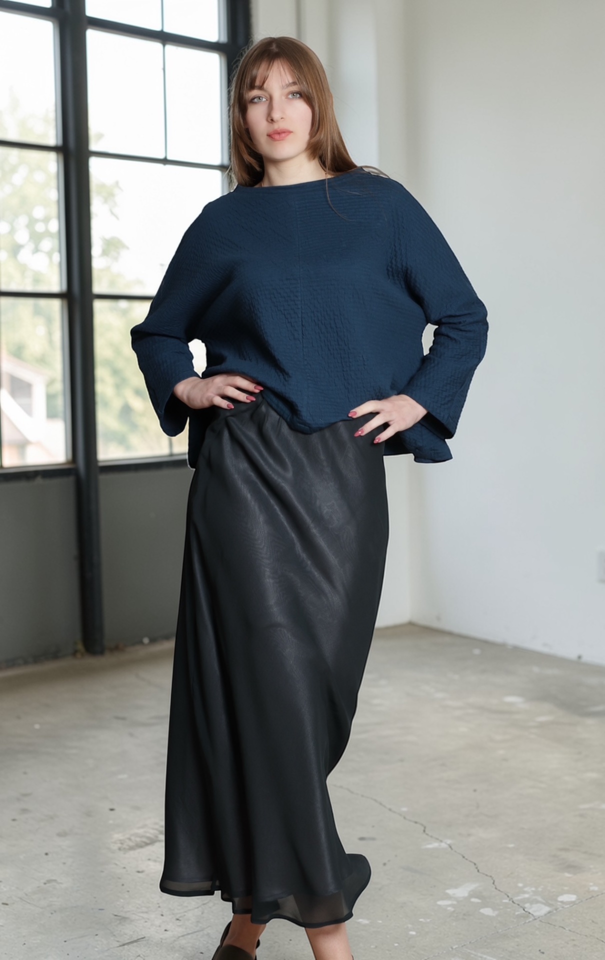 • Mulher com camisola azul escuro de manga comprida e saia preta longa