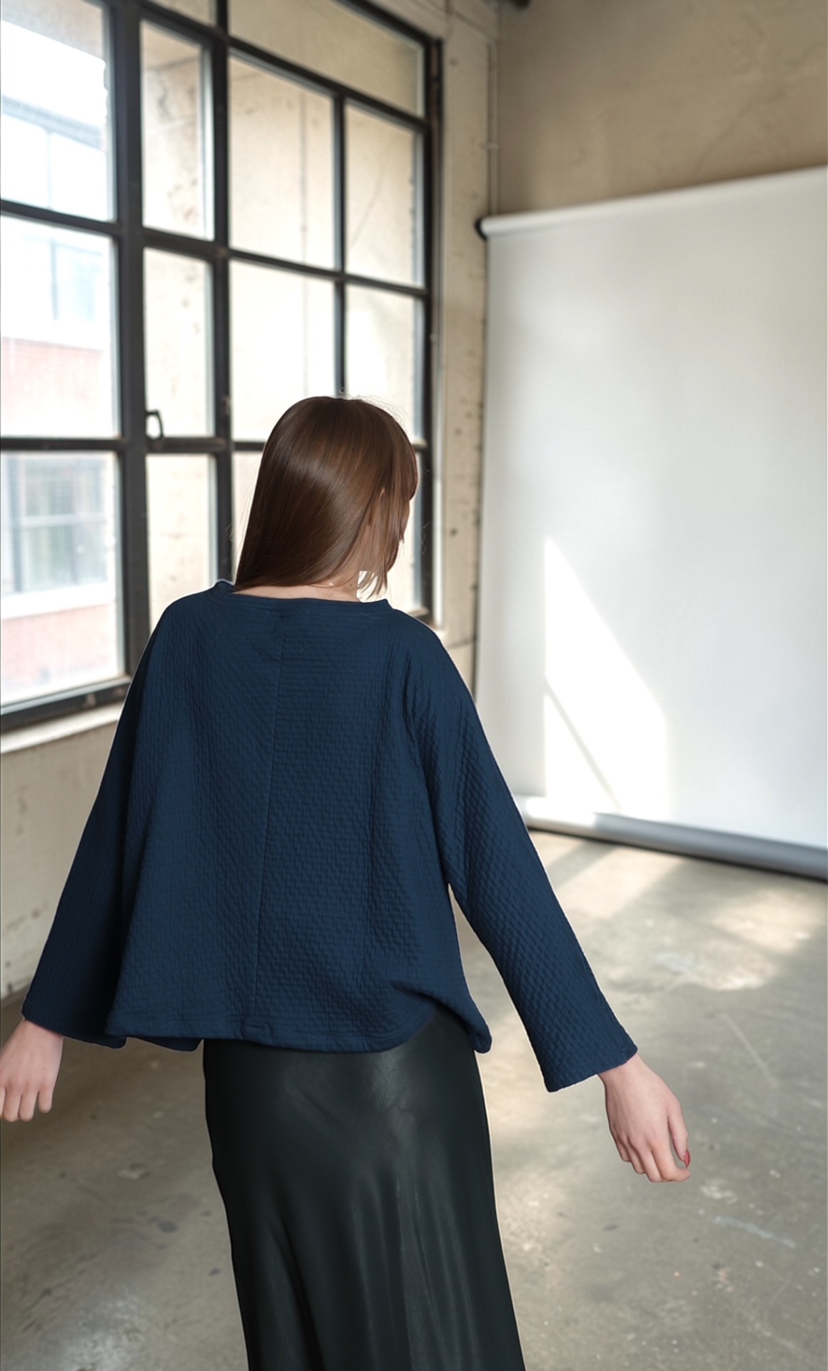 Camisola linha-A em malha efeito favo, na cor azul petróleo. Tem decote redondo e manga japonesa comprida. É uma peça muito confortável e descontraída.