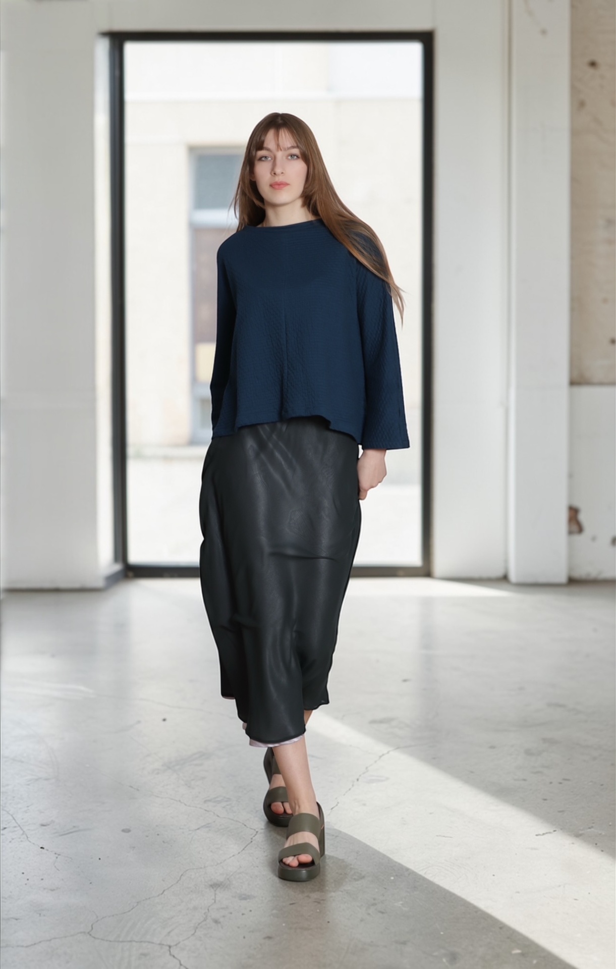 • Mulher vestindo camisola azul, saia preta tipo couro e sandálias verdes num espaço interior