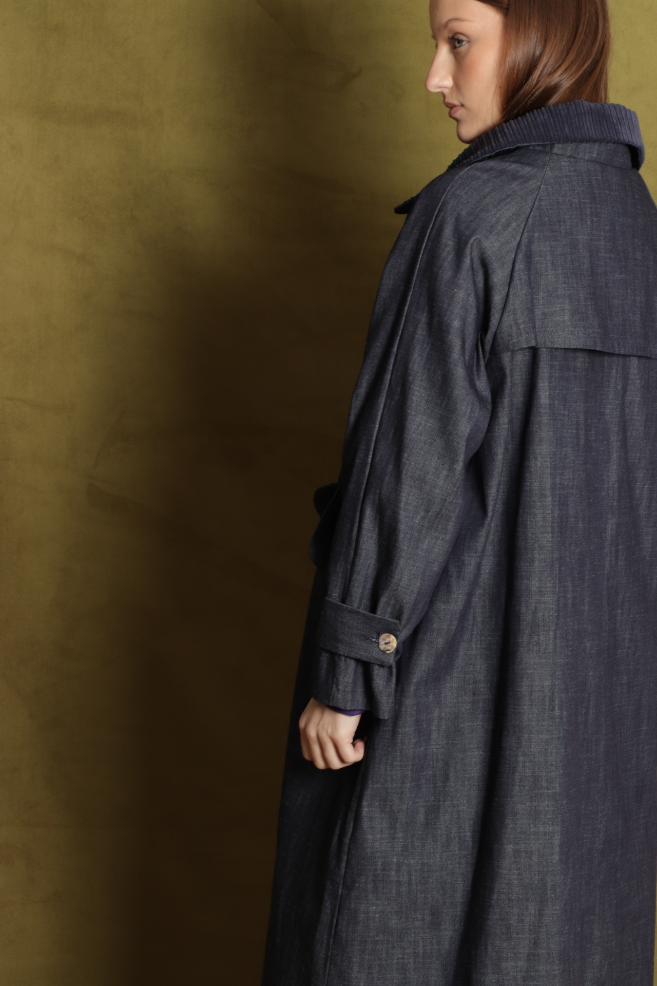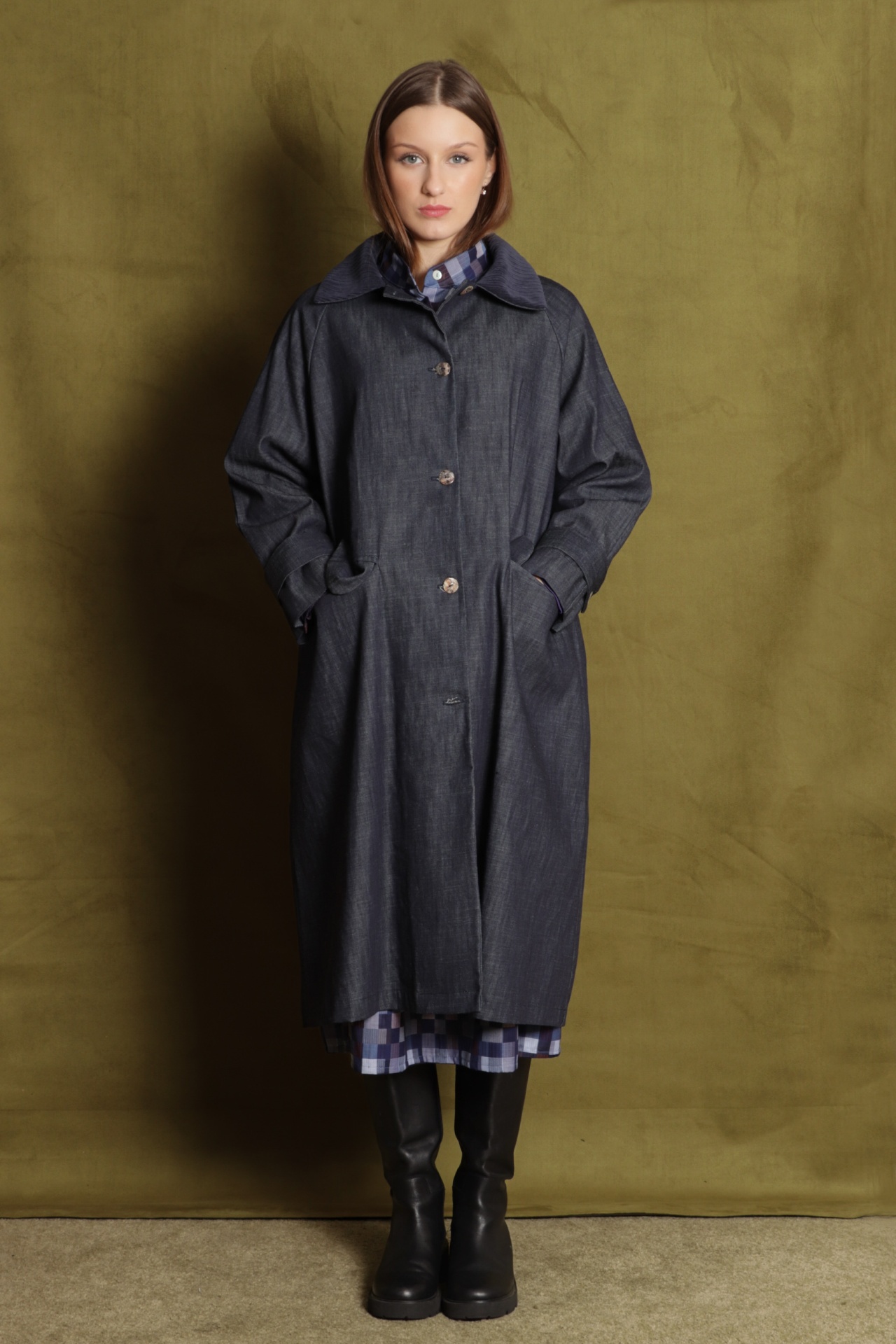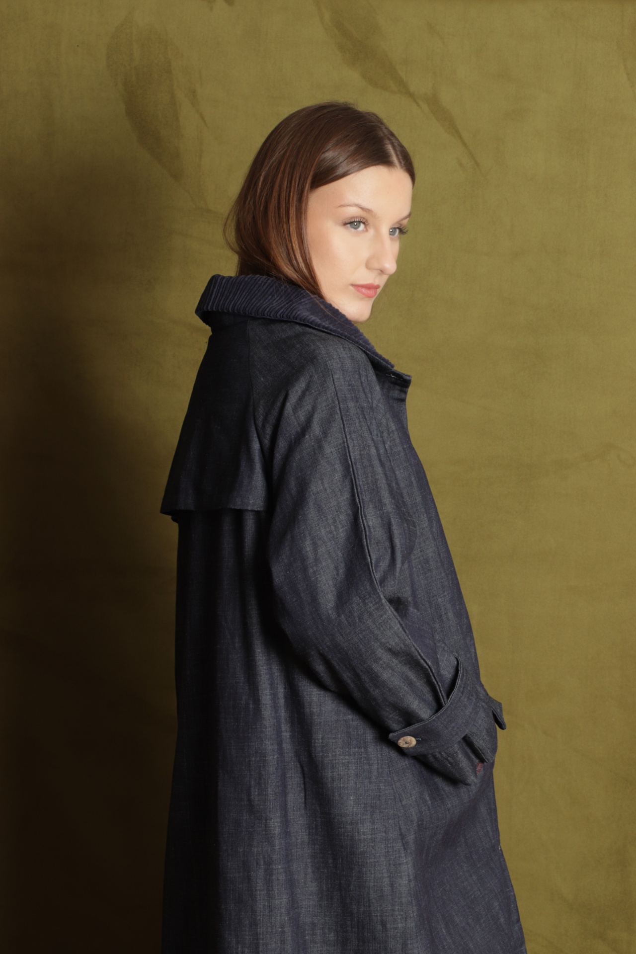 Trench Coat GOHAN 279,00 € Desconto de %. IVA incluído. Partilhar Comprar Contactar 1 unidades em stock | SKU: GOHAN-239u23 Casaco trench em ganga com forro camel. Tem mangas raglan e bolsos metidos na frente com pala. Gola em bombazine grossa. Modelo linha-A Gola em bicoManga comprida raglanBolsos metidos com palaAperta com 5 botões de madrepérola 100% algodãoTamanho únicoLargura frente abaixo da cava = 58cms (circular 116cms)Comprimento: 110 cm HANDMADE IN PORTUGAL Instruções de lavagem: aconselhamos que lave esta peça à mão por respeito ao ambiente e para garantir a durabilidade das suas peças favoritas Nota: este casaco foi fotografado com a camisa KAMEI e saia RAZU e ainda as calças NOJI e a camisola TAKAOKA