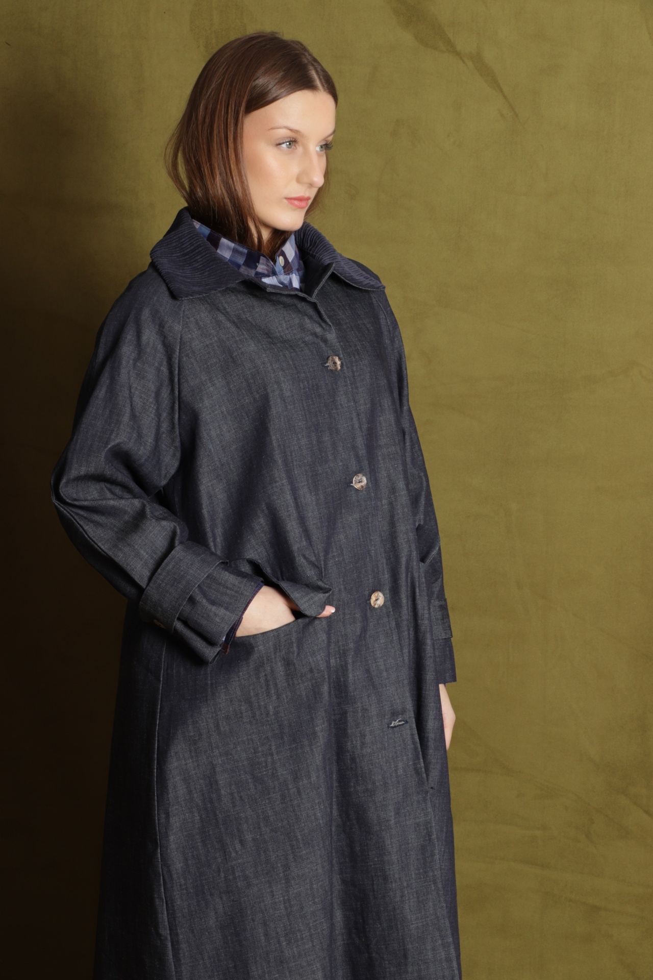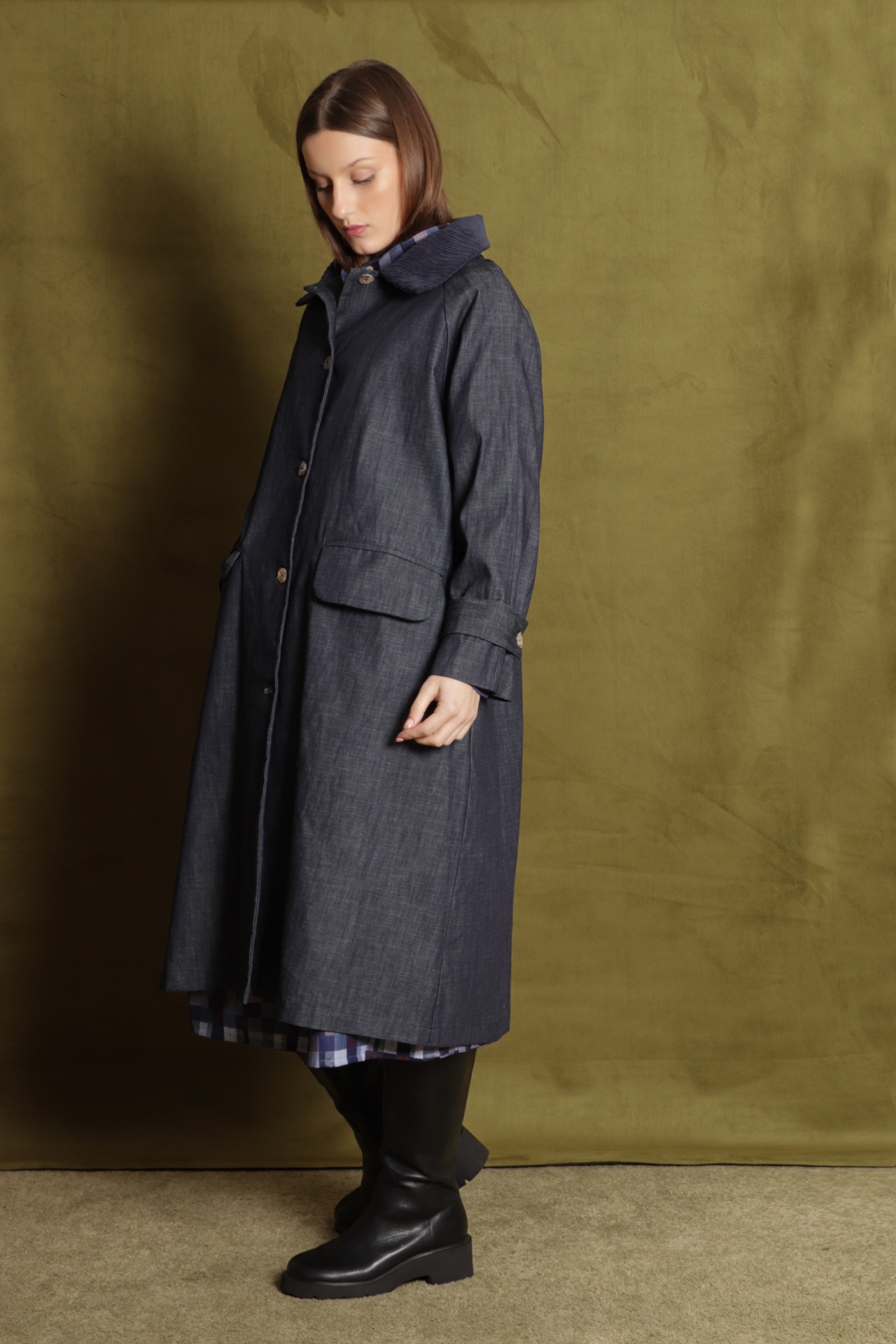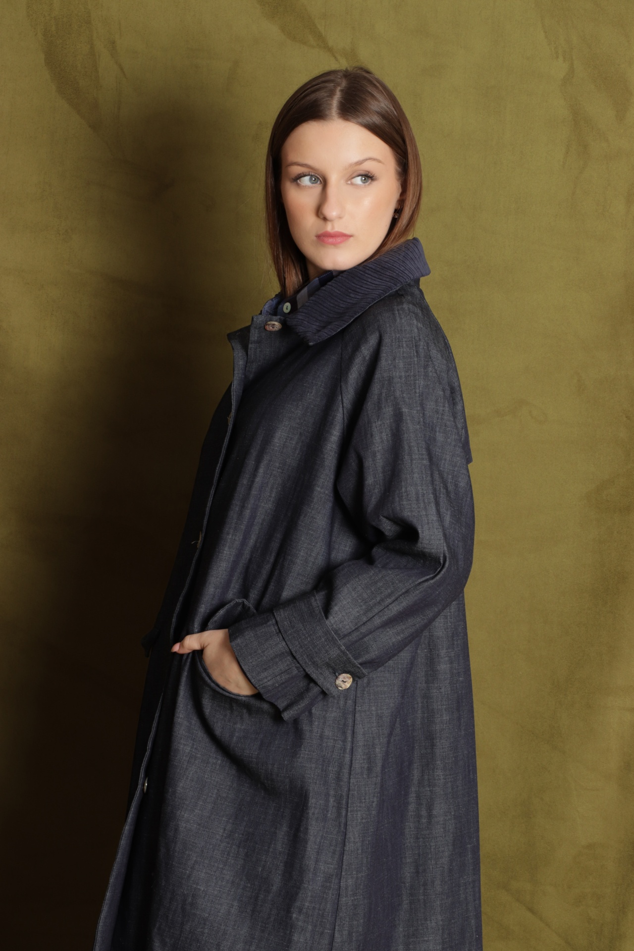 Trench Coat GOHAN 279,00 € Desconto de %. IVA incluído. Partilhar Comprar Contactar 1 unidades em stock | SKU: GOHAN-239u23 Casaco trench em ganga com forro camel. Tem mangas raglan e bolsos metidos na frente com pala. Gola em bombazine grossa. Modelo linha-A Gola em bicoManga comprida raglanBolsos metidos com palaAperta com 5 botões de madrepérola 100% algodãoTamanho únicoLargura frente abaixo da cava = 58cms (circular 116cms)Comprimento: 110 cm HANDMADE IN PORTUGAL Instruções de lavagem: aconselhamos que lave esta peça à mão por respeito ao ambiente e para garantir a durabilidade das suas peças favoritas Nota: este casaco foi fotografado com a camisa KAMEI e saia RAZU e ainda as calças NOJI e a camisola TAKAOKA