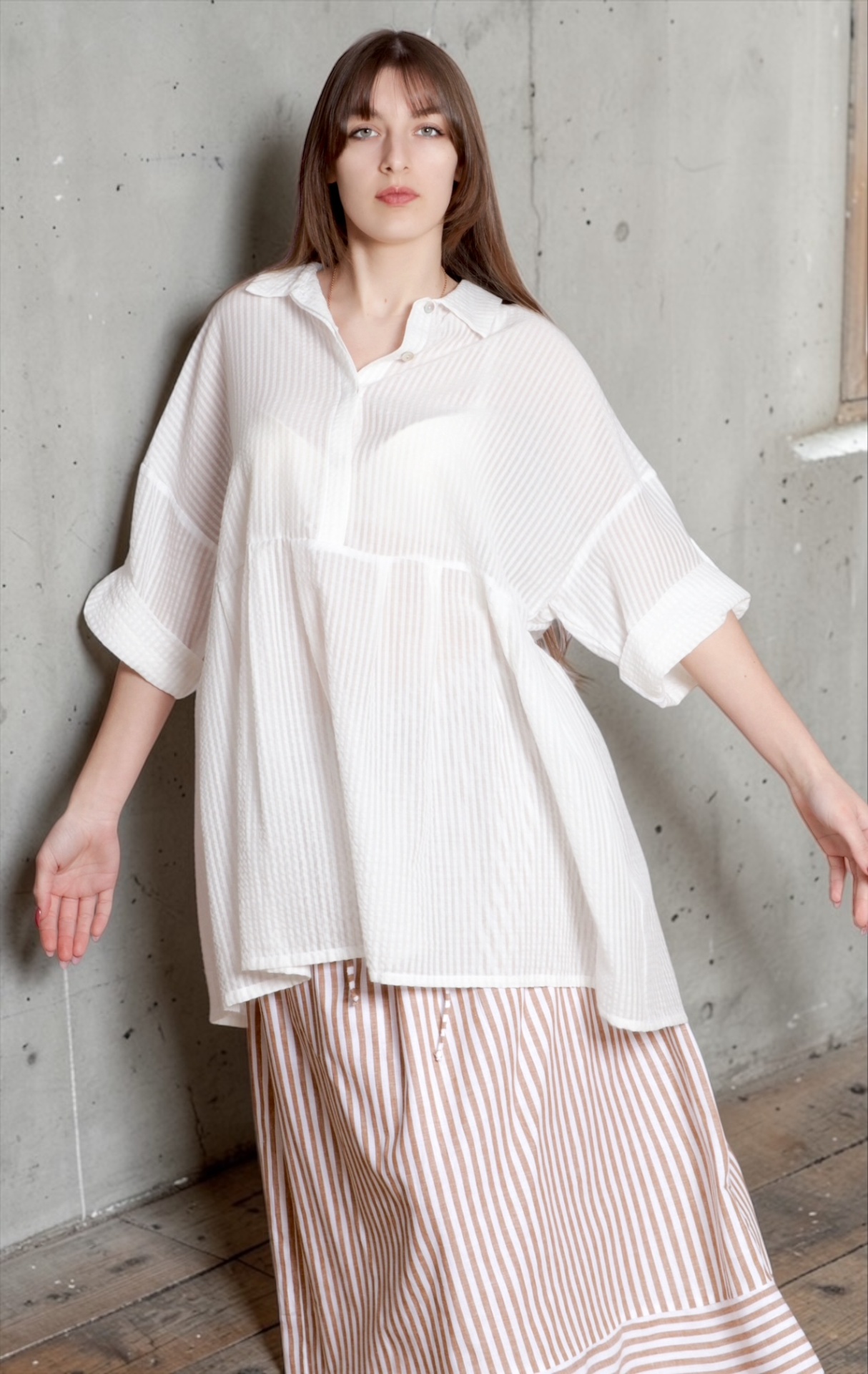 • Mulher vestindo blusa branca semi-transparente riscada e saia midi com riscas castanhas e brancas, com sapatilhas bege, em ambiente interior com parede cinza e chão de madeira