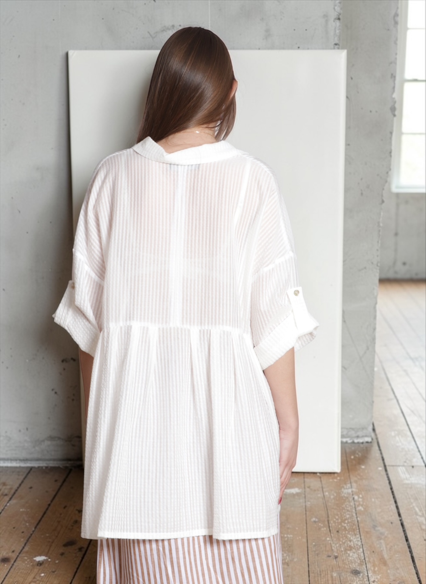Túnica camiseiro oversize (veste até ao XL) em seersucker brqnco. Tem manga pelo cotovelo, que pode ser subida e fixada com presilha e botão. Modelo solto, oversize, com pregas na frente e costas.