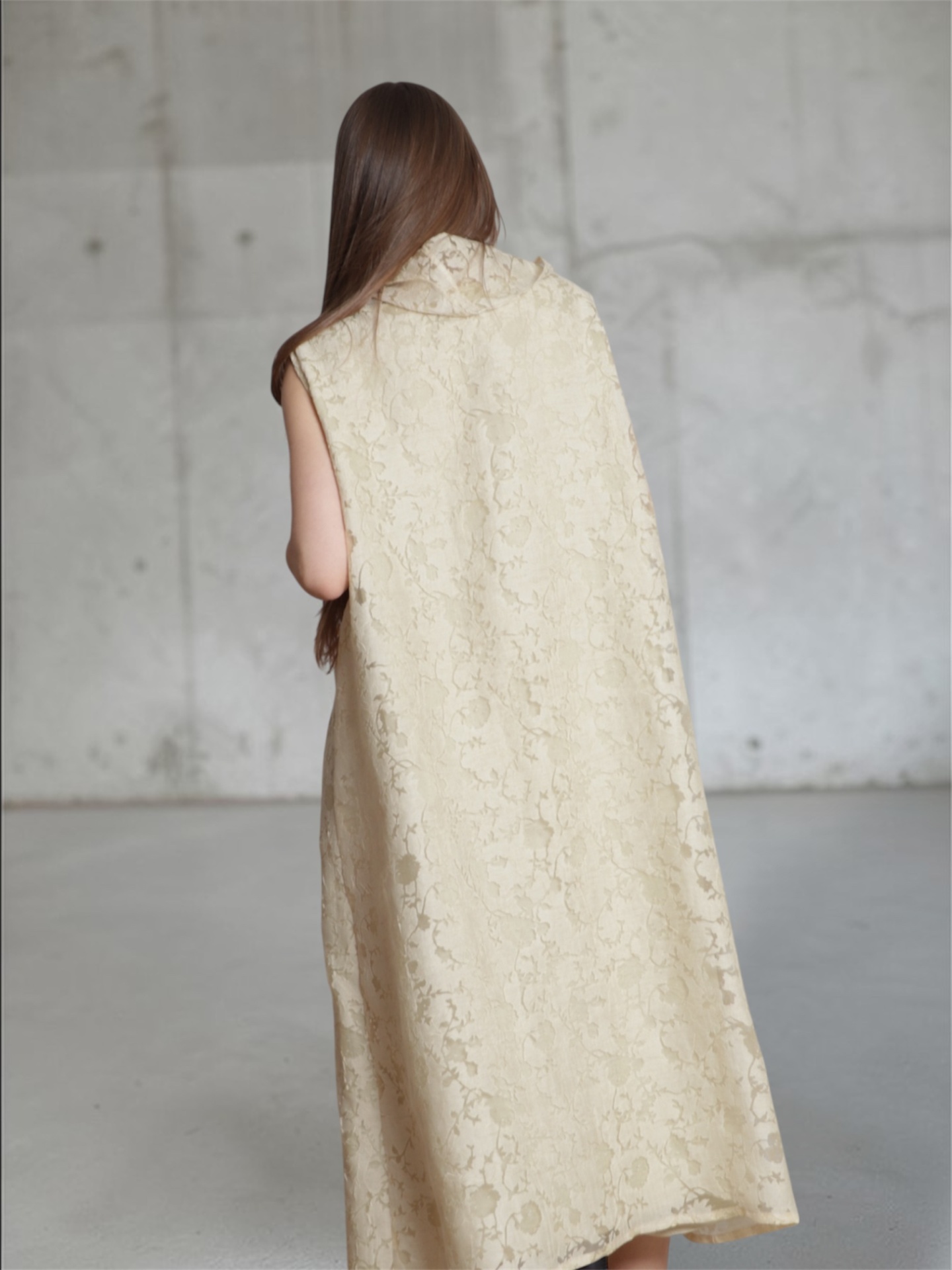 • Vestido longo bege com padrão floral em relevo visto de costas