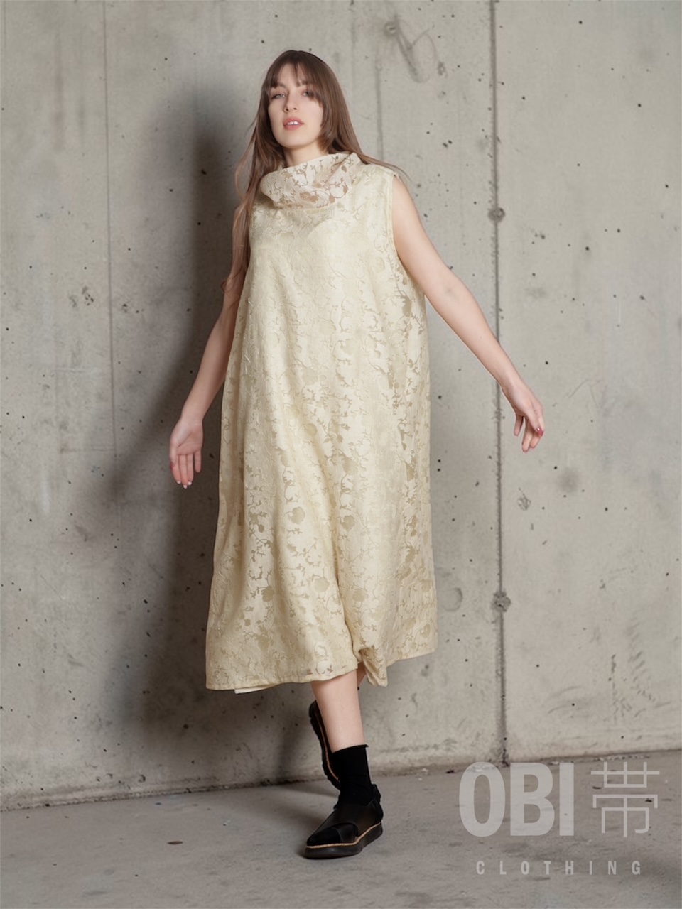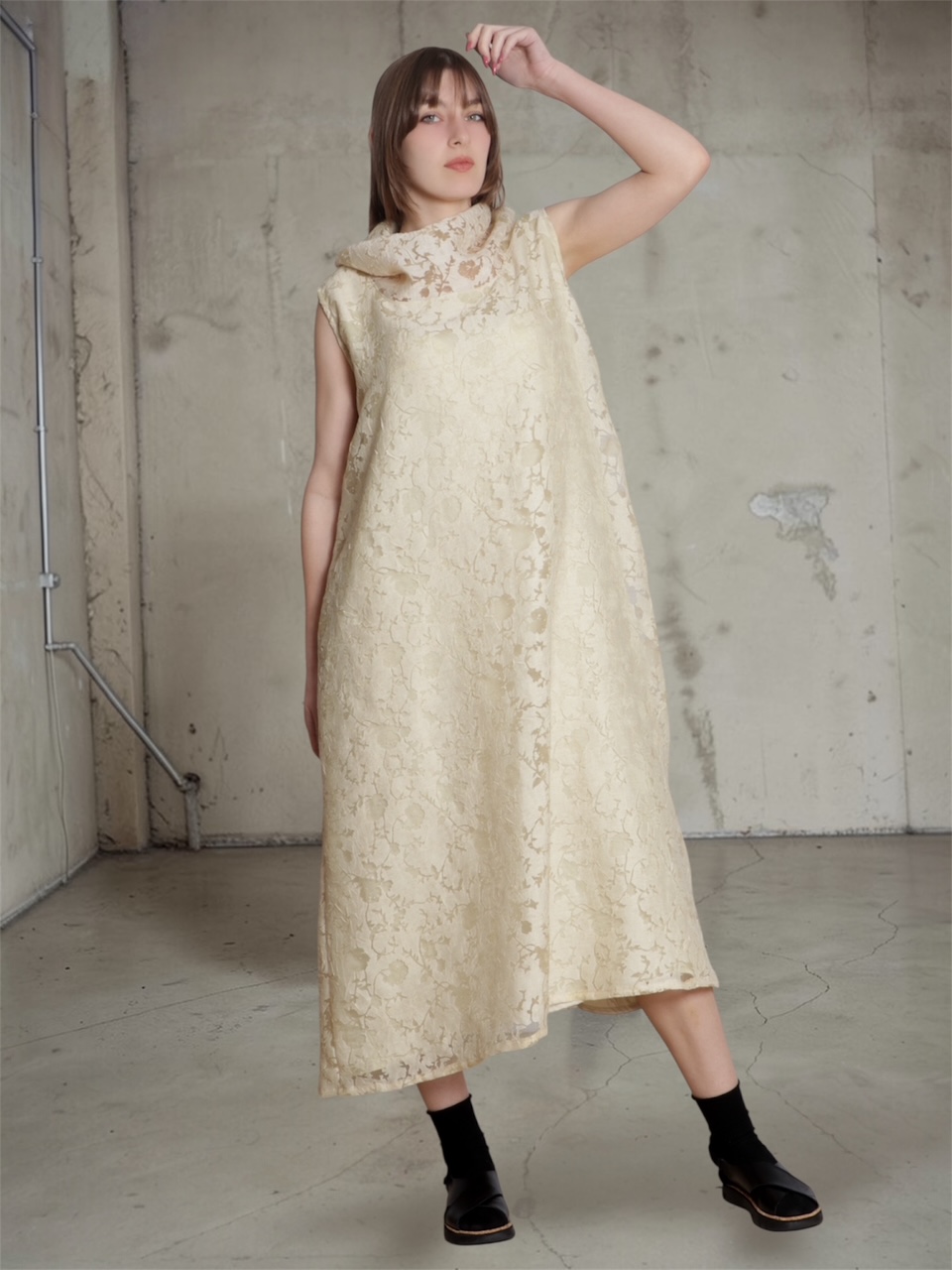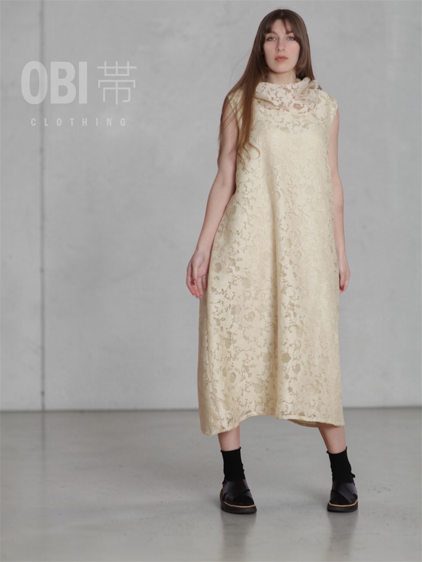 • Vestido comprido creme com padrão floral texturizado e gola alta, usado com sapatos pretos e meias pretas em fundo cinzento