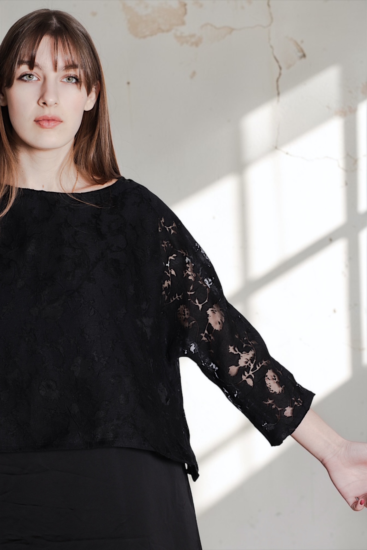 • Blusa preta feminina com mangas rendadas e tecido opaco, usada por mulher em ambiente iluminado