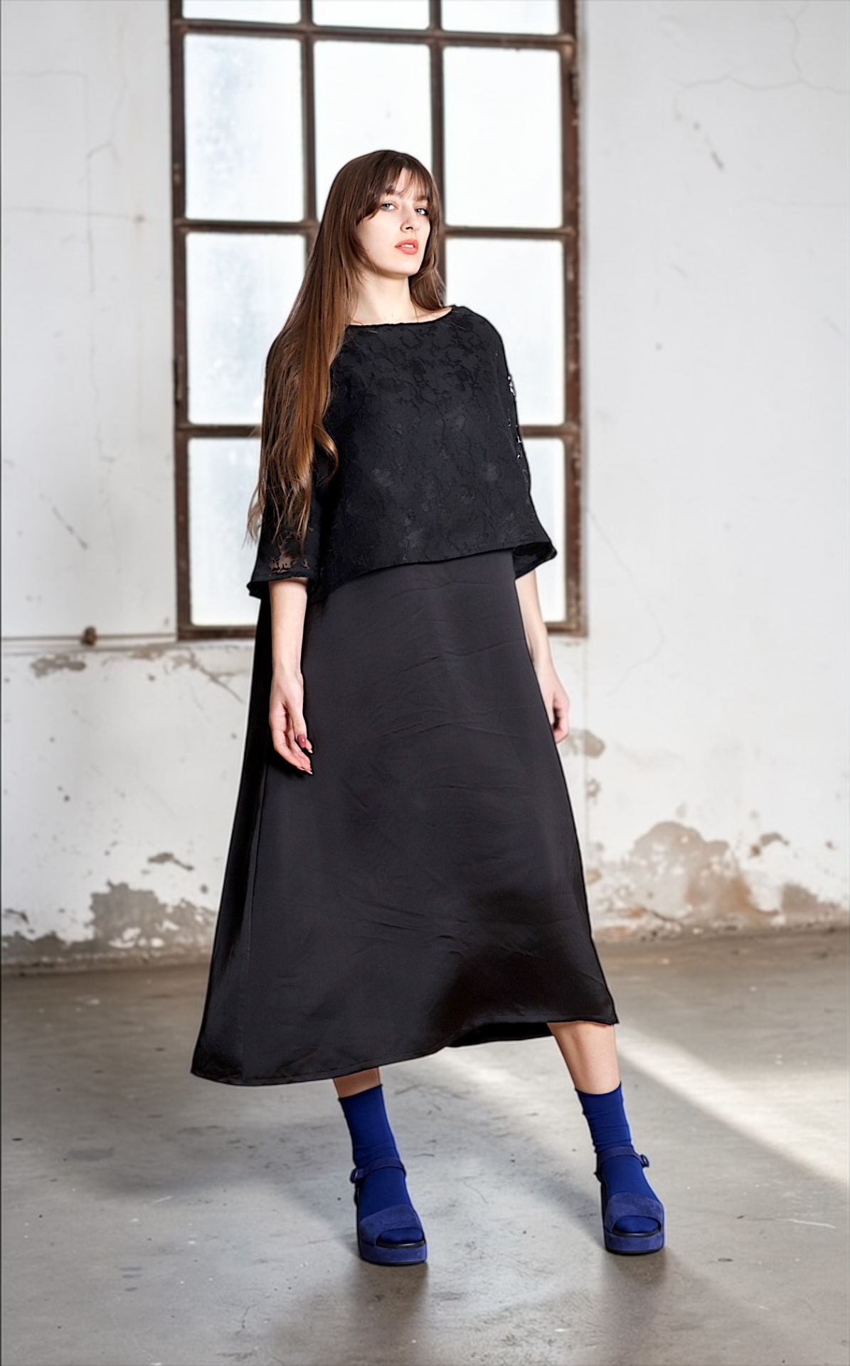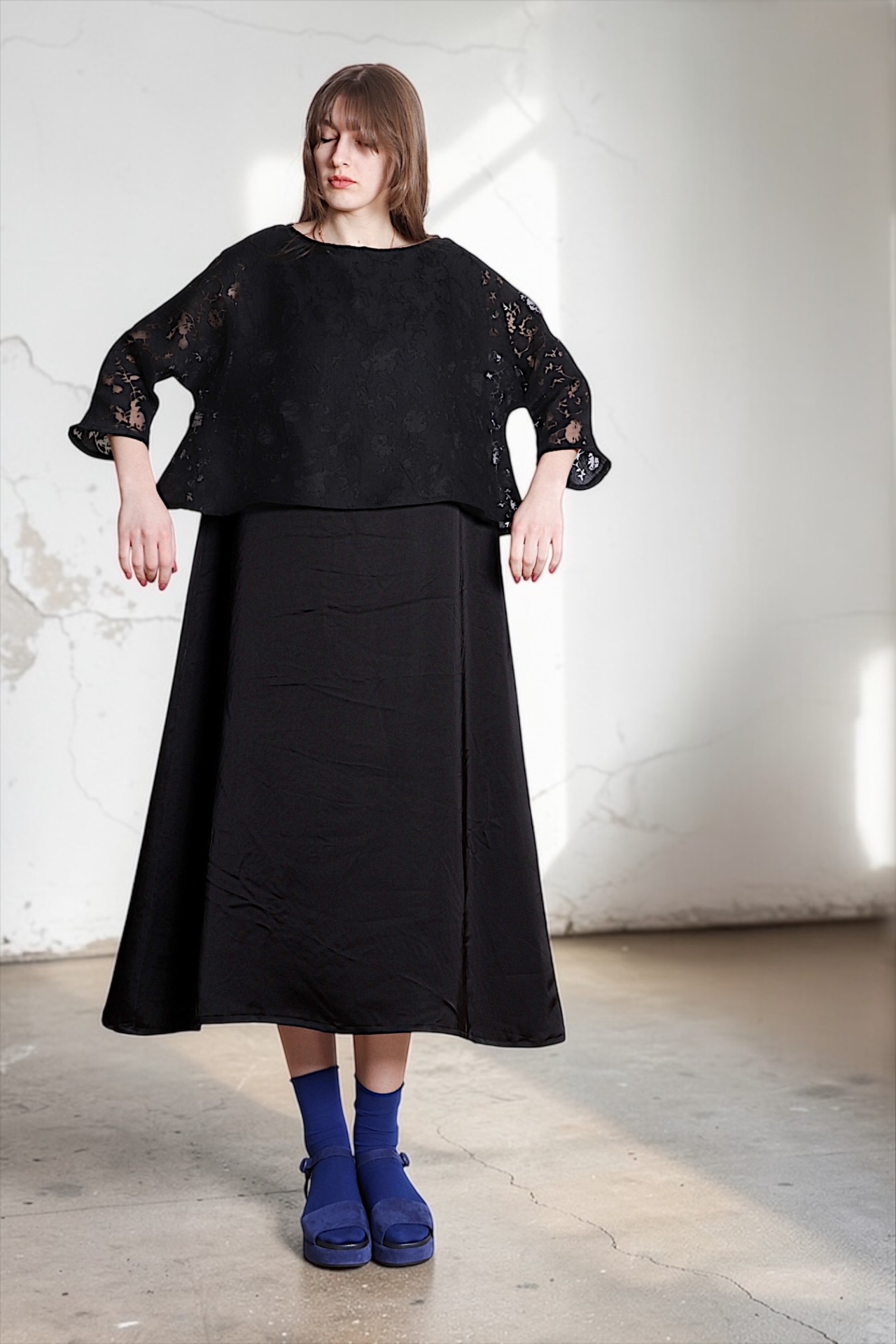 • Blusa preta em renda com mangas transparentes e saia preta comprida em ambiente interior