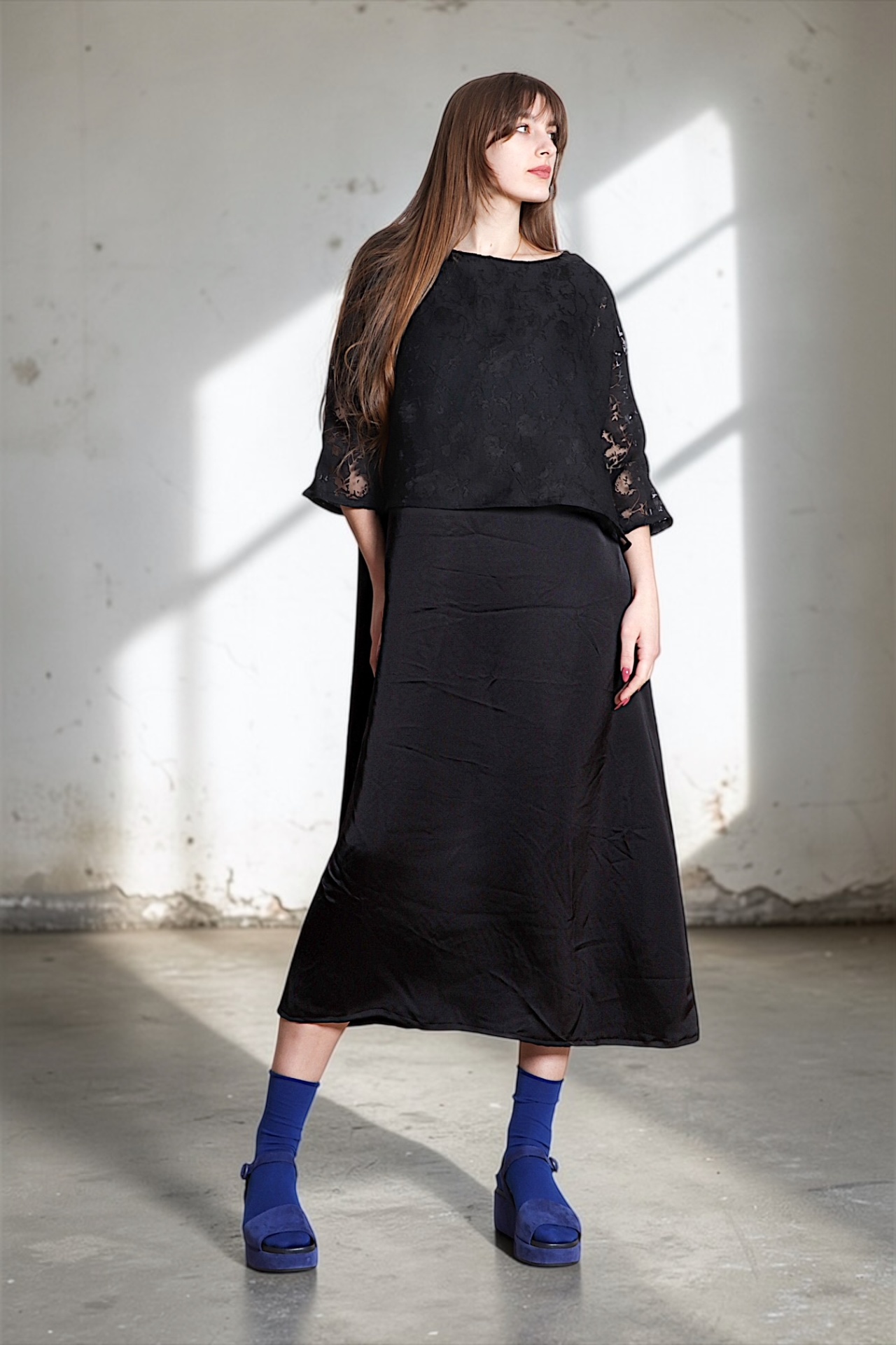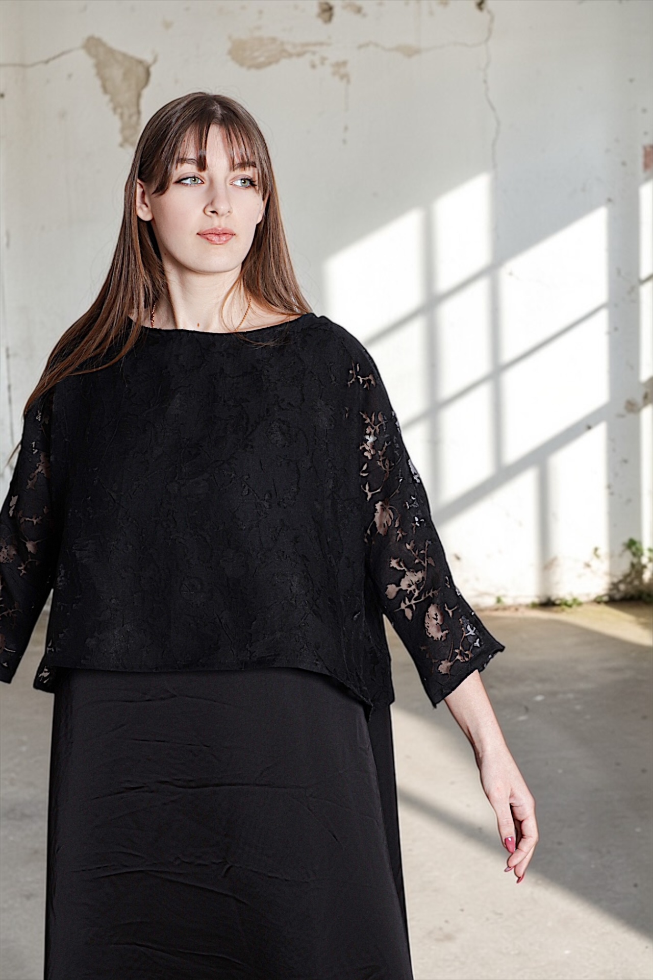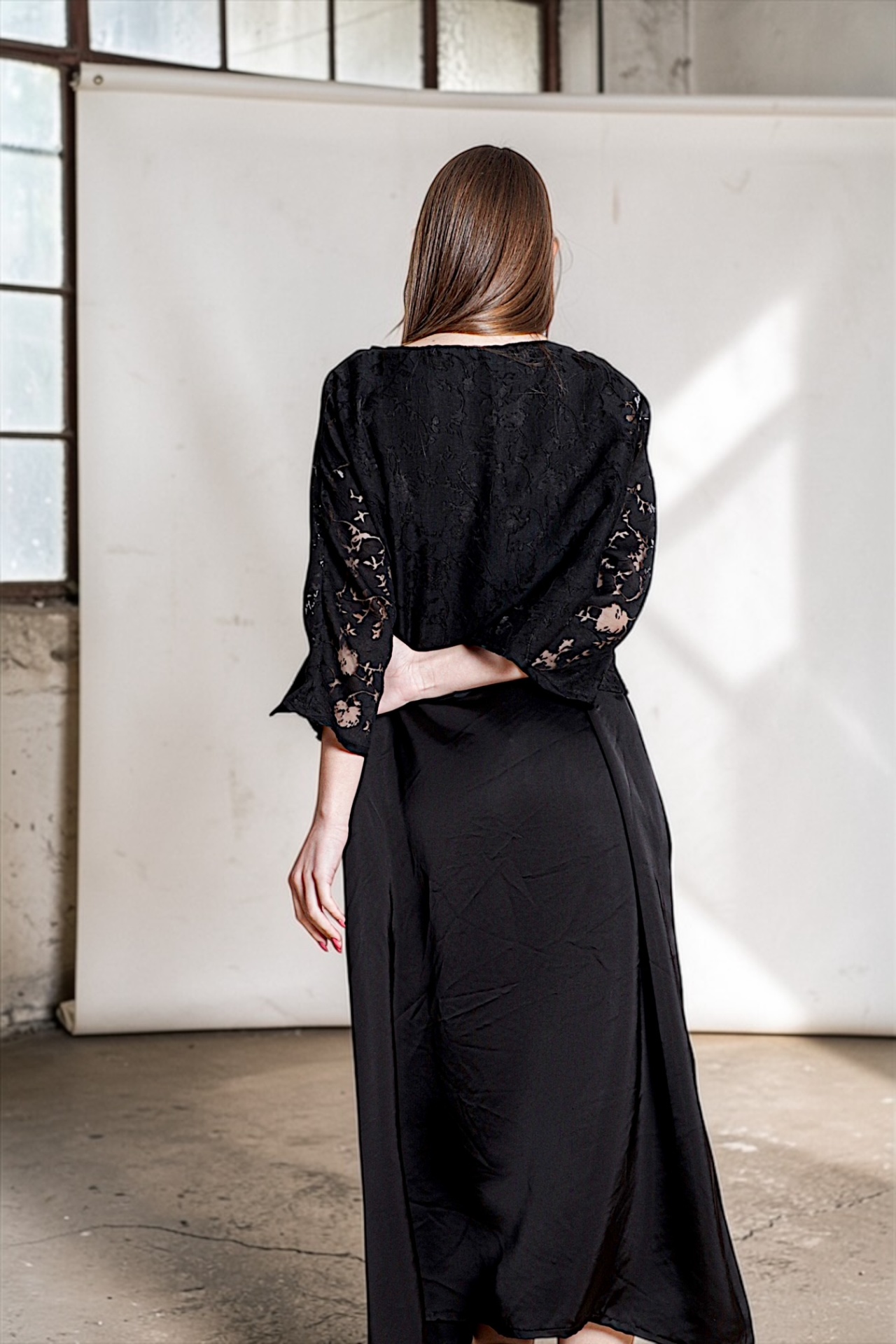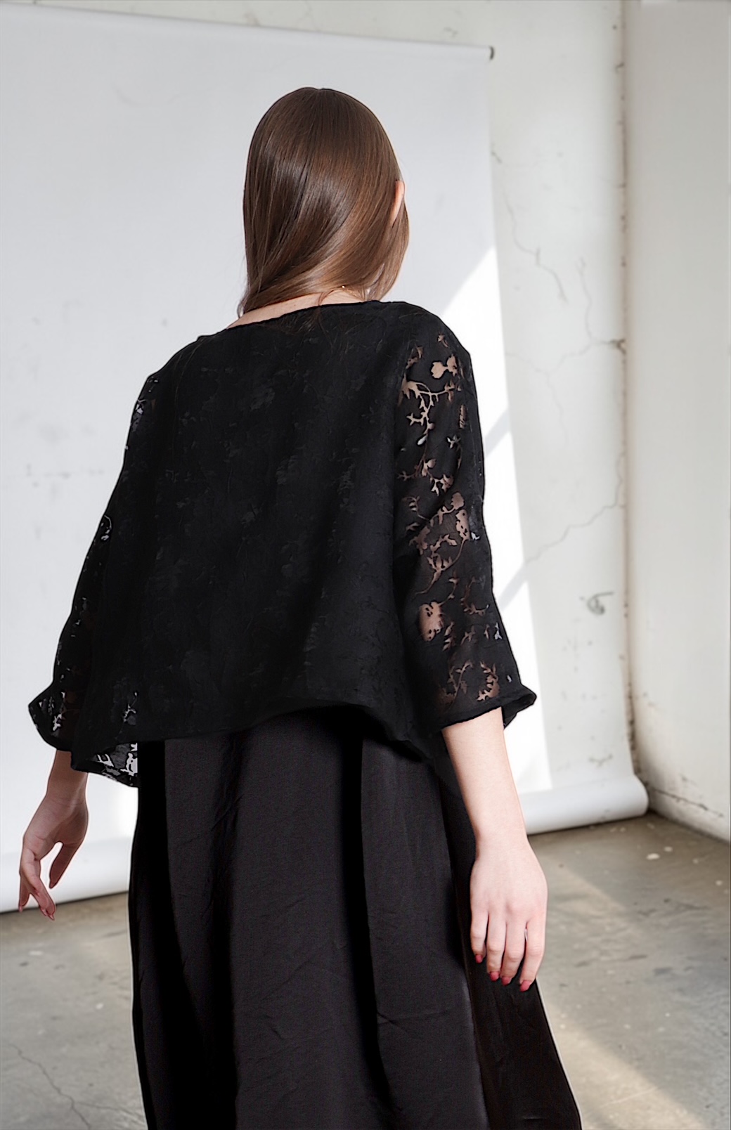 • Casaco preto com padrão floral translúcido nas mangas e vestido preto