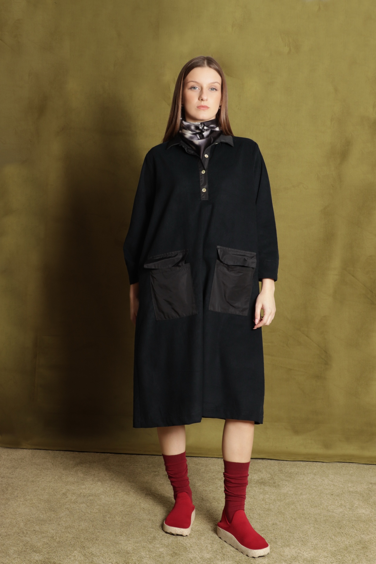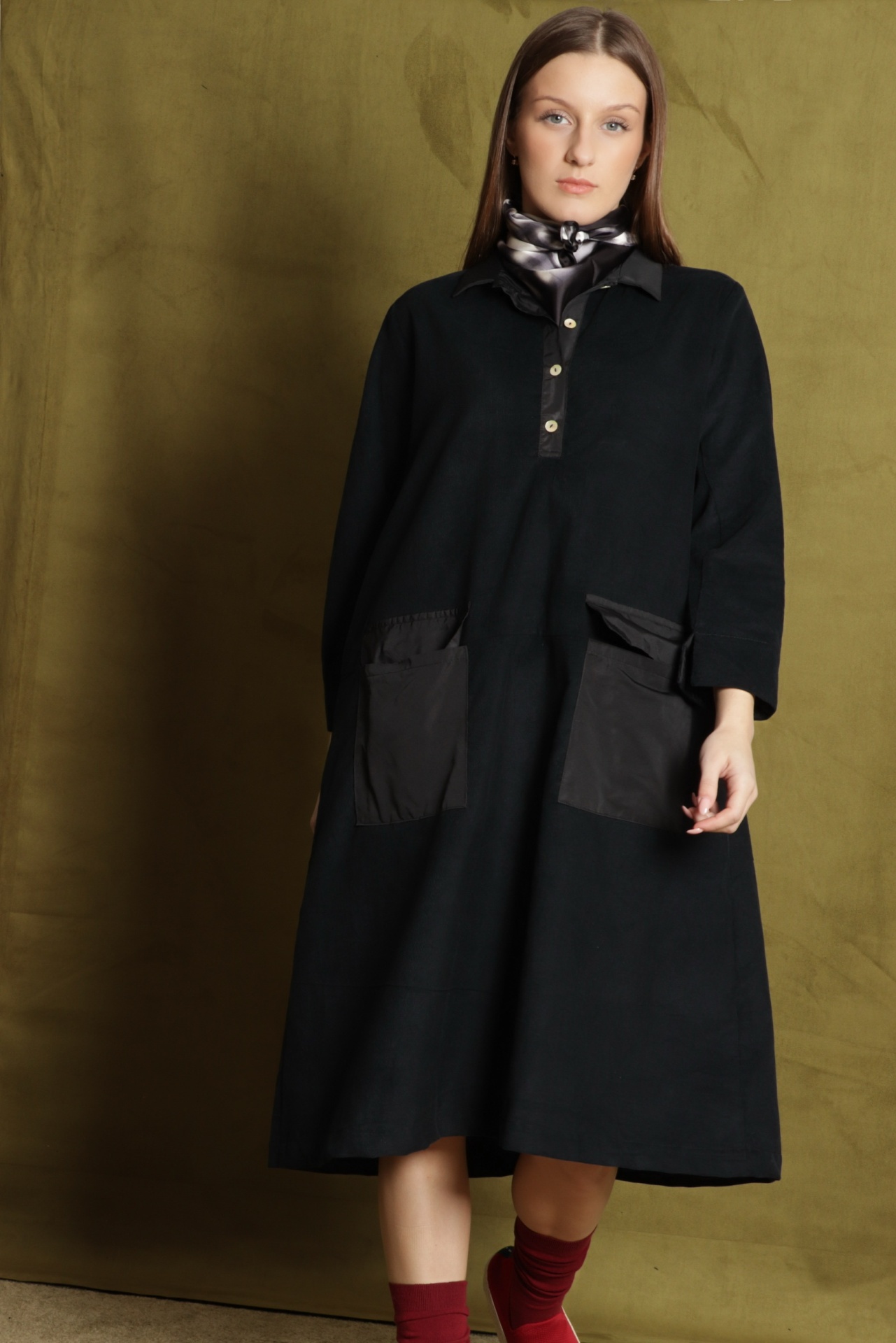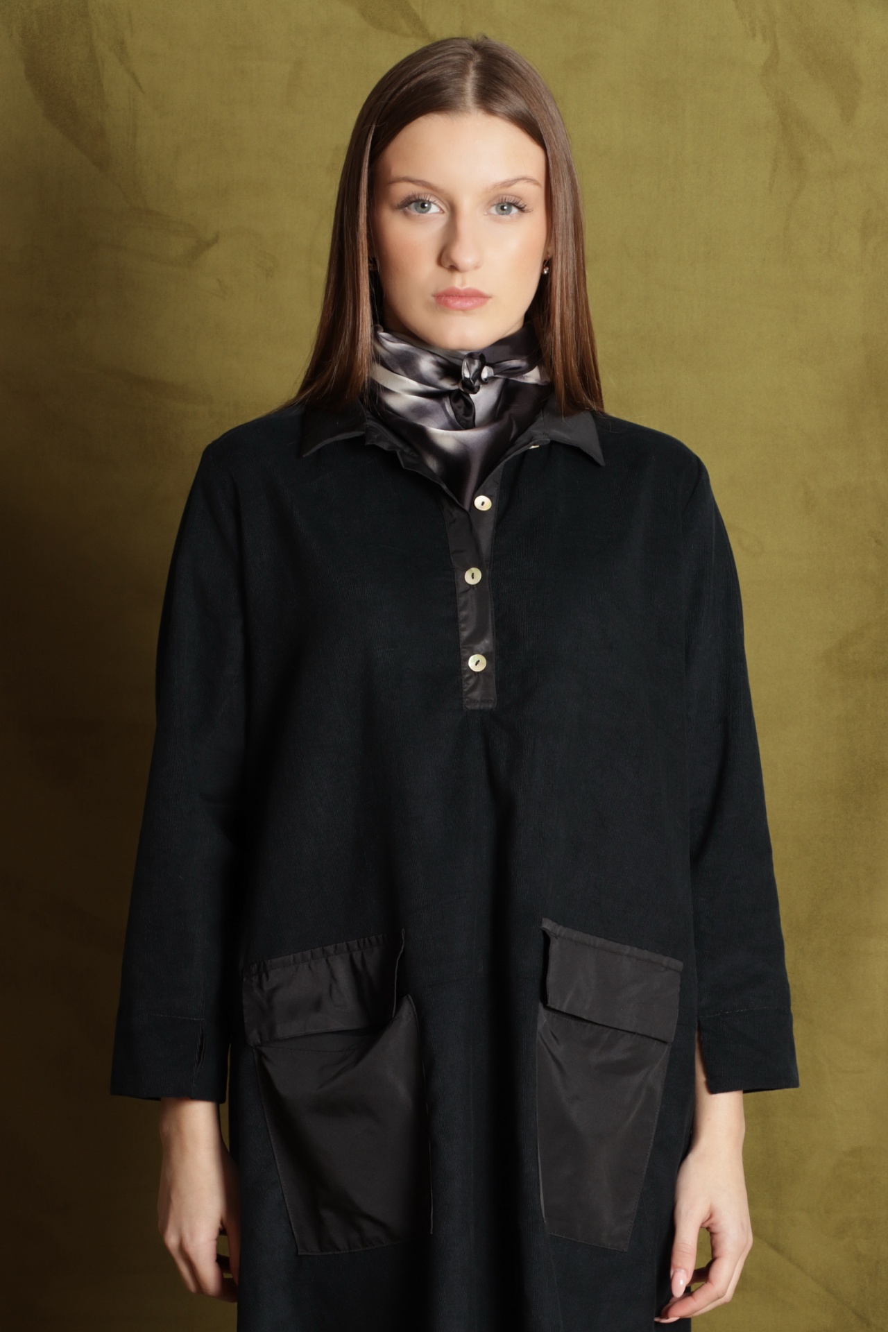 Vestido camiseiro linha-A em bombazine preta com aplicações em tafetá preto. Gola de camisaria com meia carcela dupla e 4 botões de madrepérola, bolsos de chapa com pala e interior do punho em tafetá preto. É um vestido muito prático e descontraído.