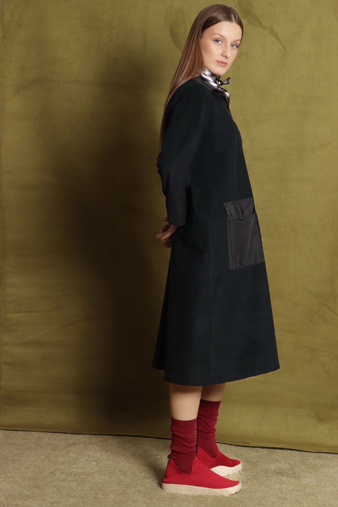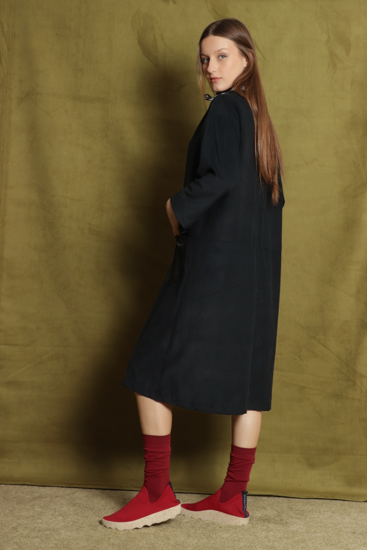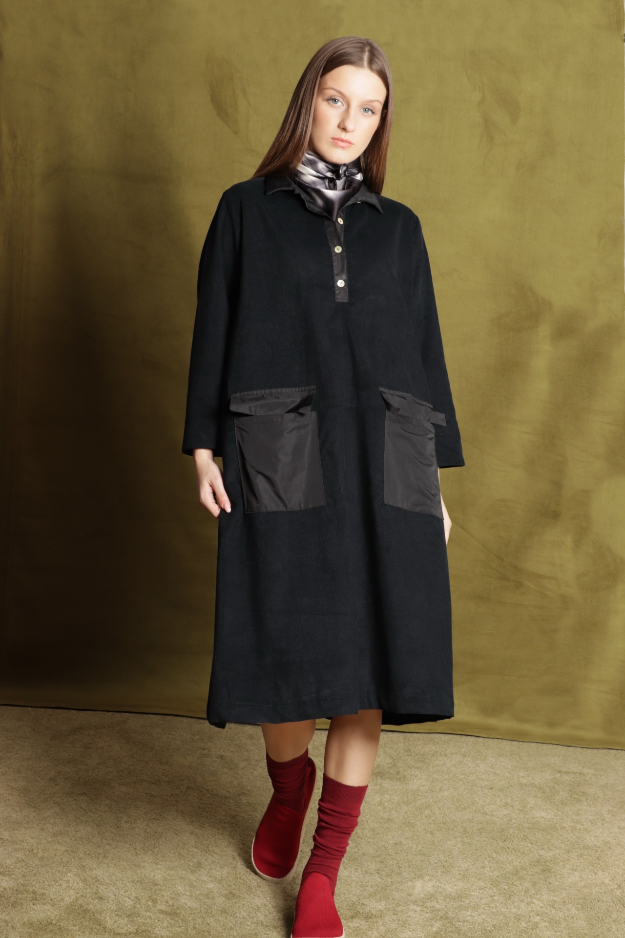 Vestido camiseiro linha-A em bombazine preta com aplicações em tafetá preto. Gola de camisaria com meia carcela dupla e 4 botões de madrepérola, bolsos de chapa com pala e interior do punho em tafetá preto. É um vestido muito prático e descontraído.